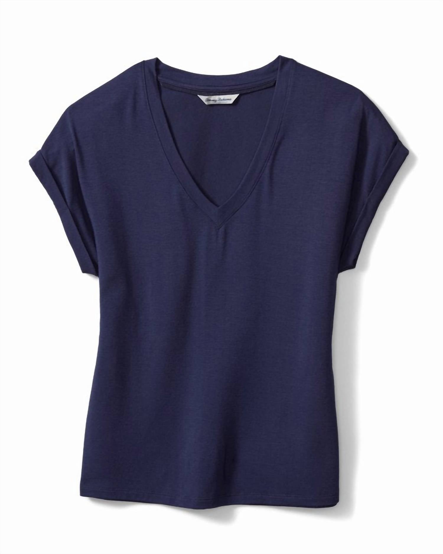This classic, short sleeve tee will be your go-to staple this season and beyond. Introducing the Jersey V-Neck Tee by TOMMY BAHAMA in a sophisticated navy hue. This short sleeve top marries comfort with style, featuring a modal-blend composition of 67% TENCEL™ Modal, 28% polyester, and 5% spandex, offering a luxurious feel with just the right amount of stretch. The tee's V-neckline is designed to flatter and elongate the body, perfect for pairing with short length necklaces. With a convenient pull-on closure and a length of 25" from shoulder to hem (based on a size S), it's ideal for a casual, easy fit. Crafted from sustainable materials and imported, this tee is machine washable on a gentle cycle and can be tumble dried low or dry cleaned for effortless care.