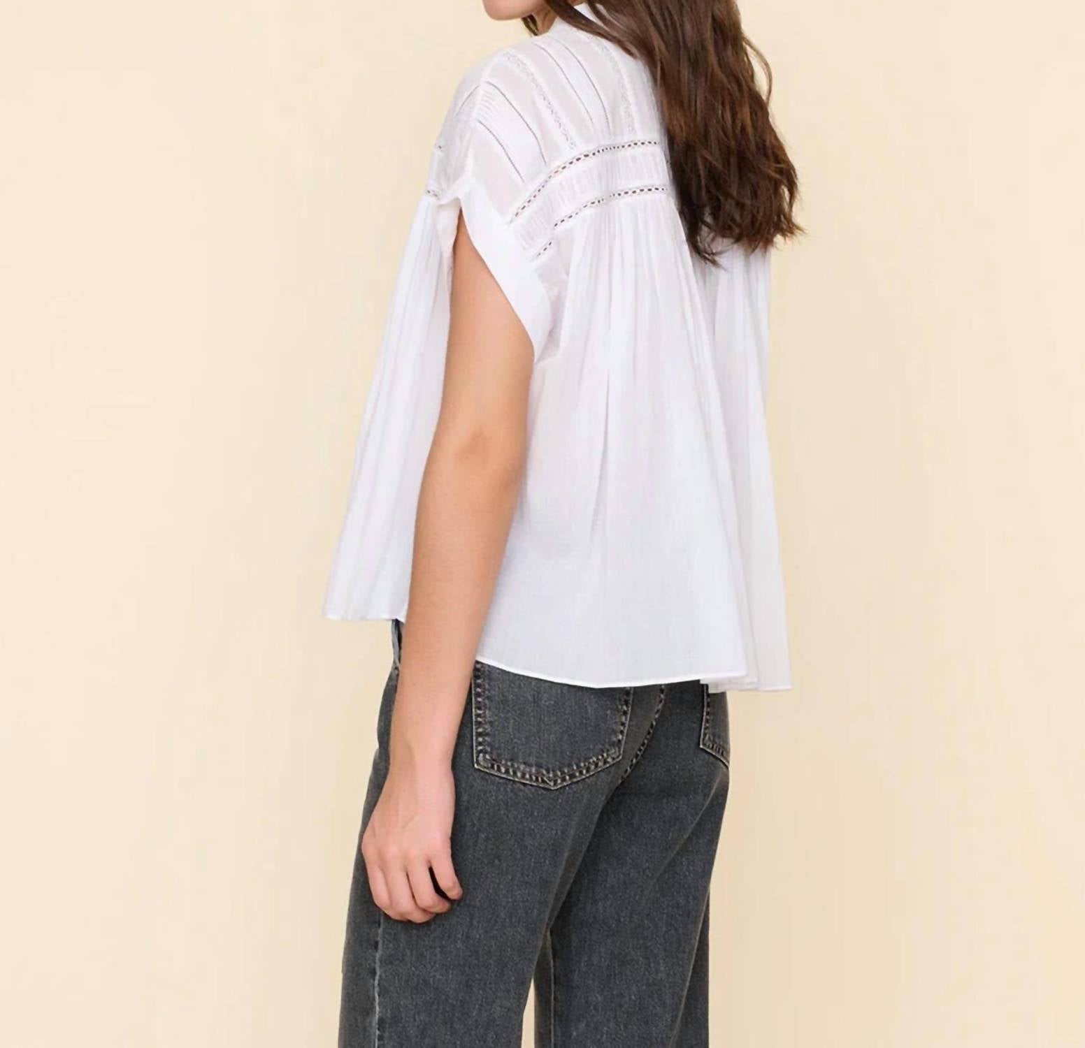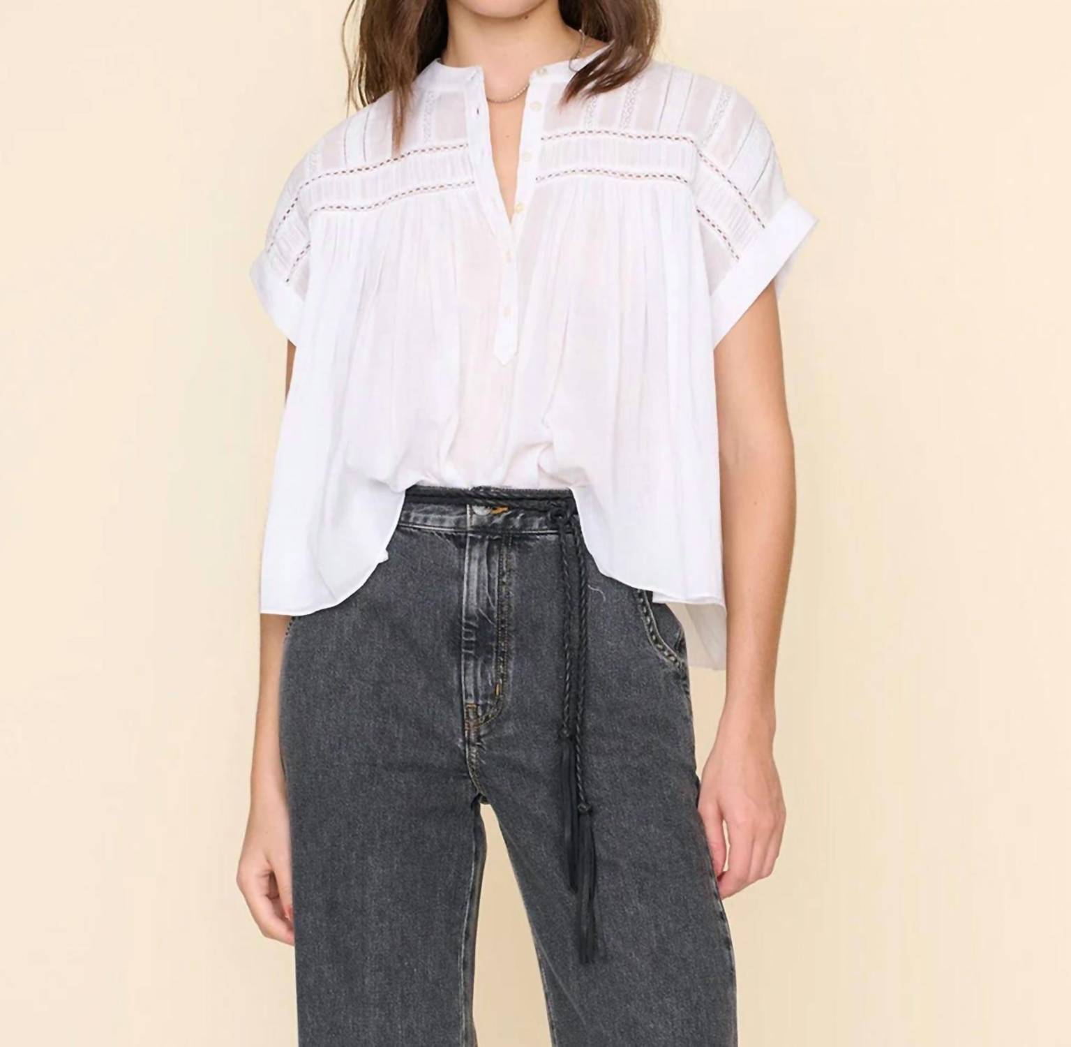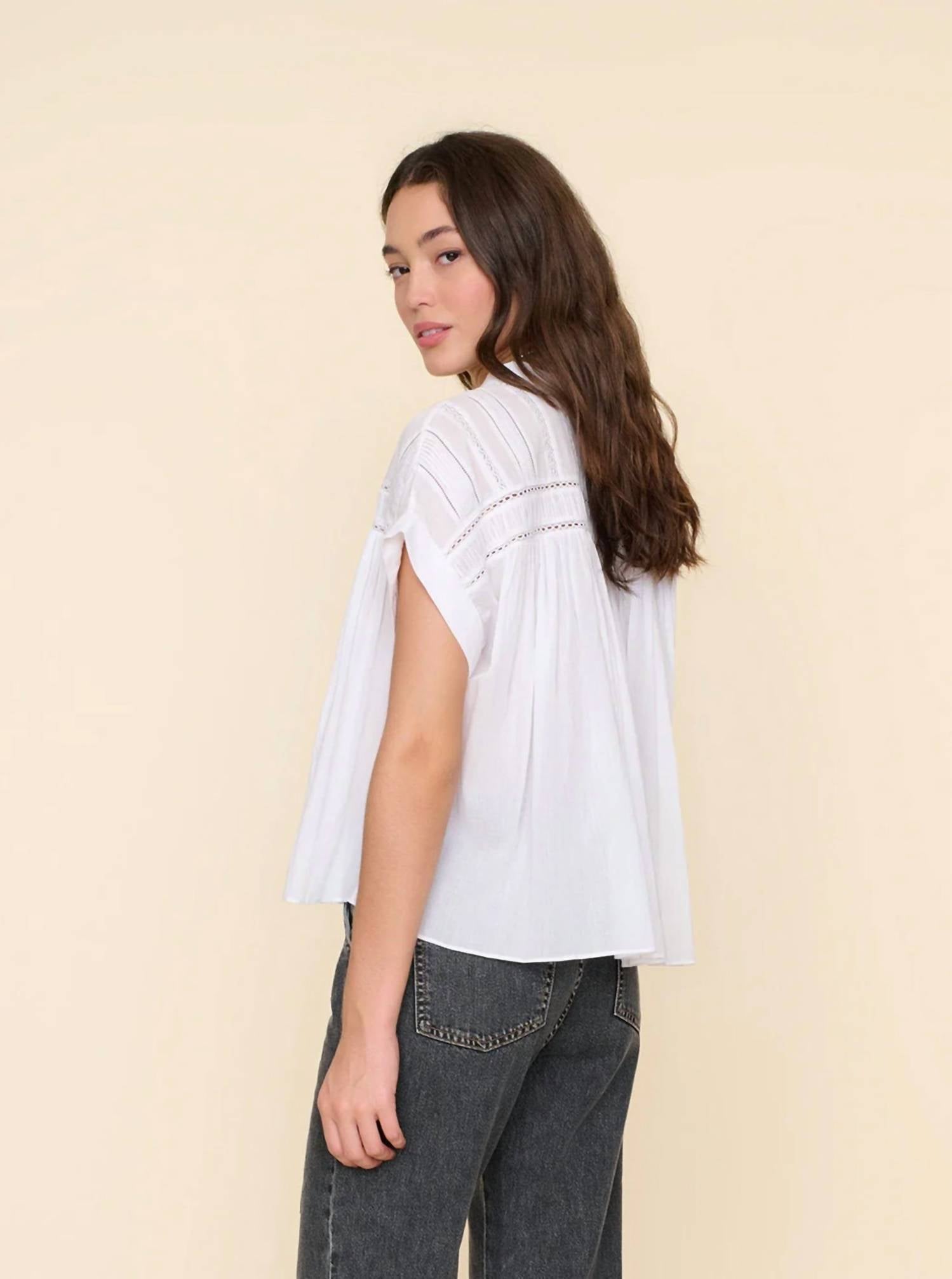 A versatile blouse that works from desk to dinner! Embrace a touch of elegance with the Louella Top by XIRENA in sophisticated white, perfect for any occasion. This solid short-sleeve blouse is crafted from superfine cotton voile, ensuring a soft and delicate feel. It features a partial button-front with a chic band collar, complemented by pintucks, lace trim, and shirred yokes for added femininity. Designed without a closure, this piece is effortlessly wearable and a must-have in your wardrobe.