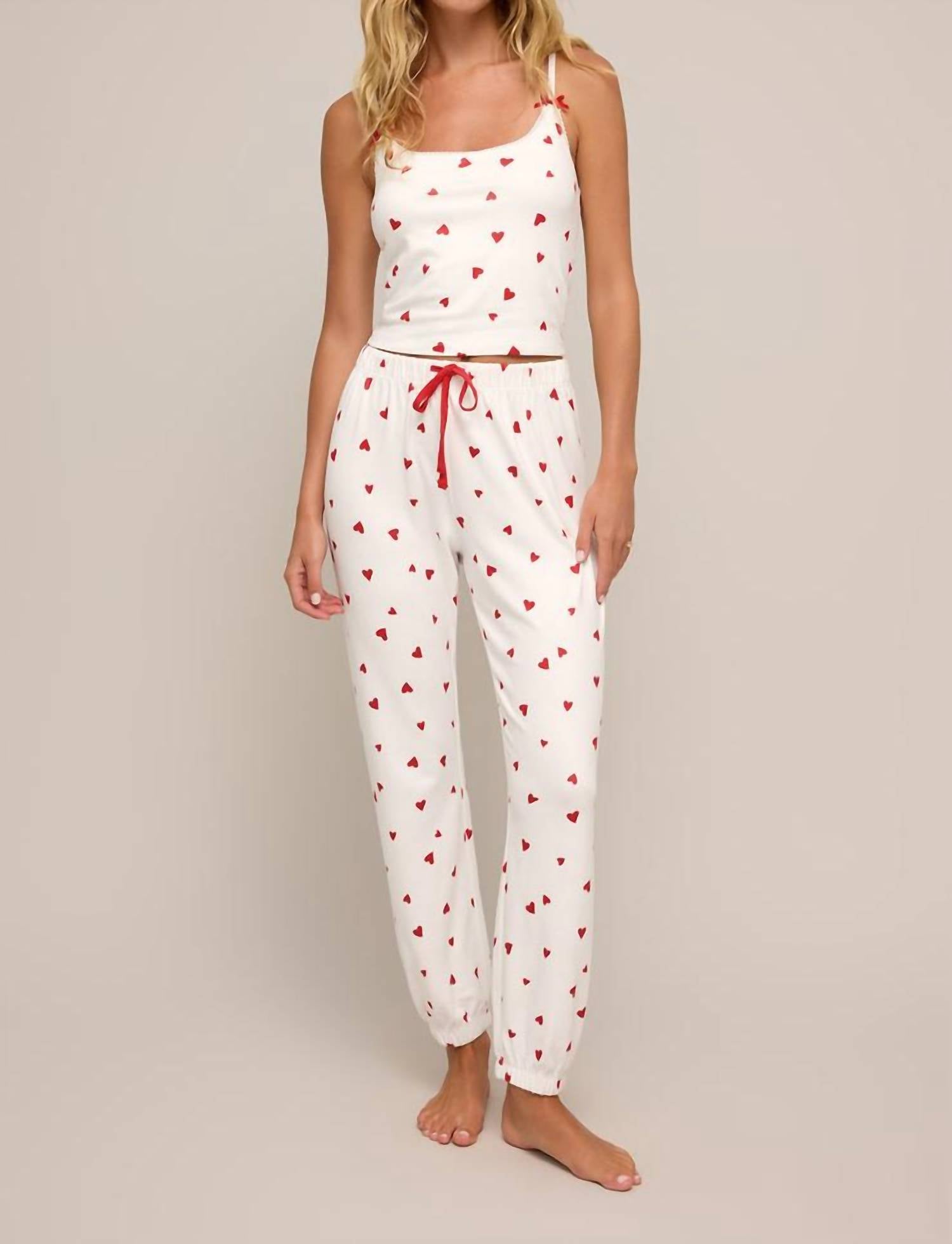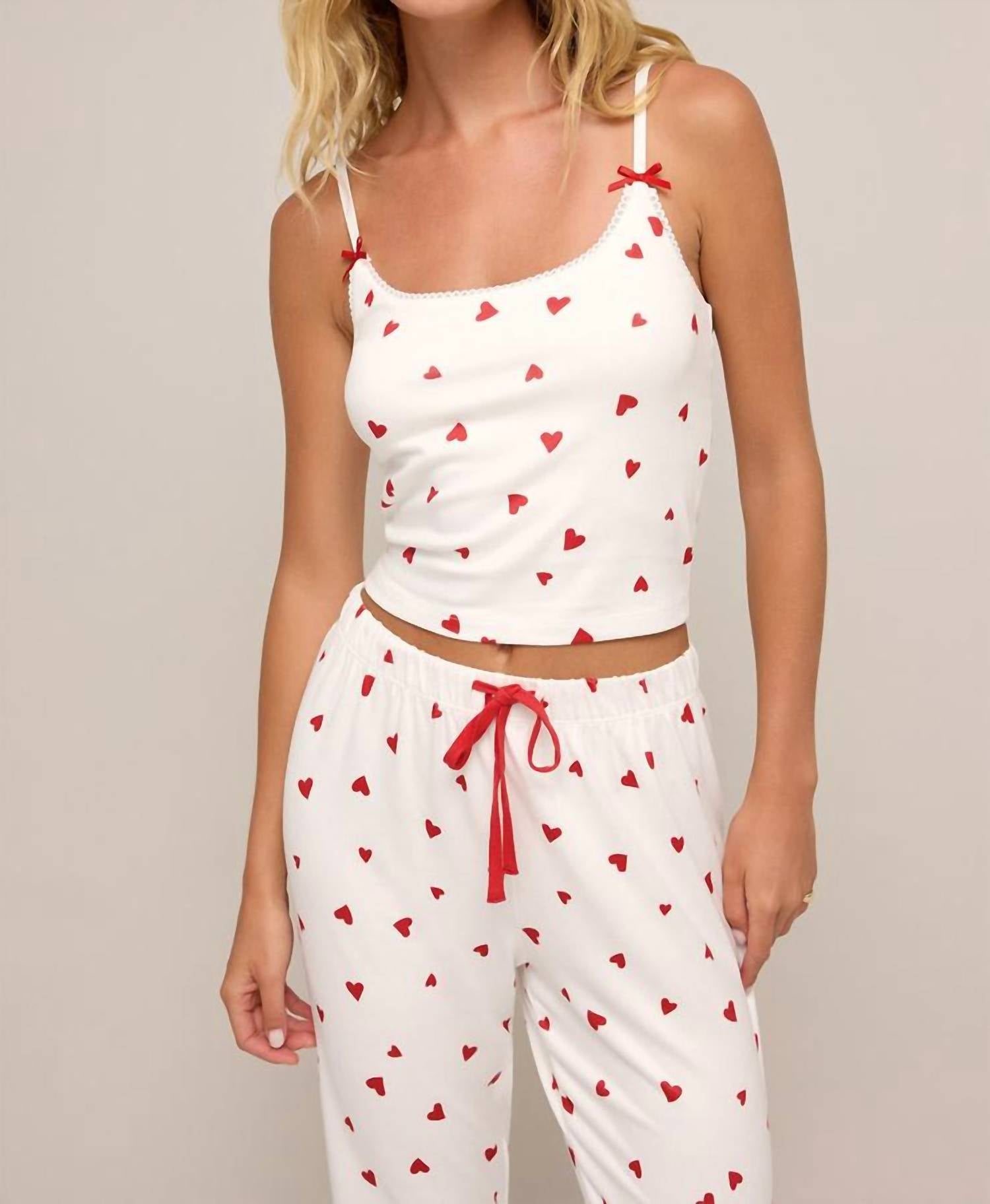 This classic tank top is perfect for layering and cute enough to wear on its own. This cami features an allover heart print and sweet bow details on the adjustable straps. It has a scoop neck, sleeveless design, adjustable spaghetti straps, and a shelf bra. Made from 95% polyester and 5% spandex. Machine wash cold, gentle cycle, tumble dry low or lay flat to dry.