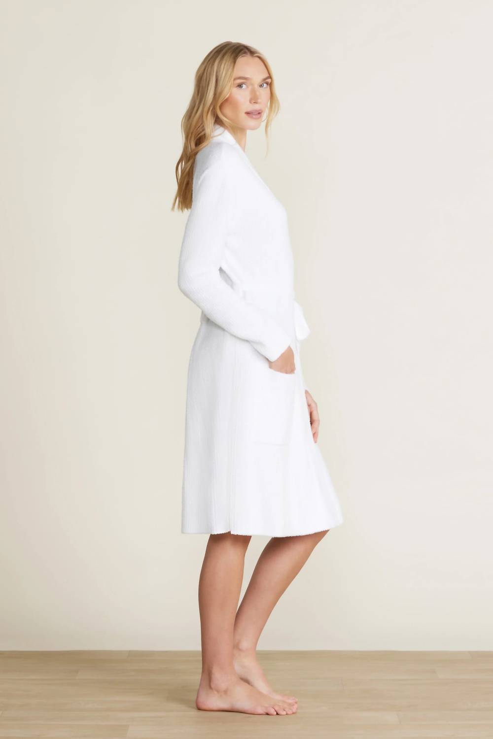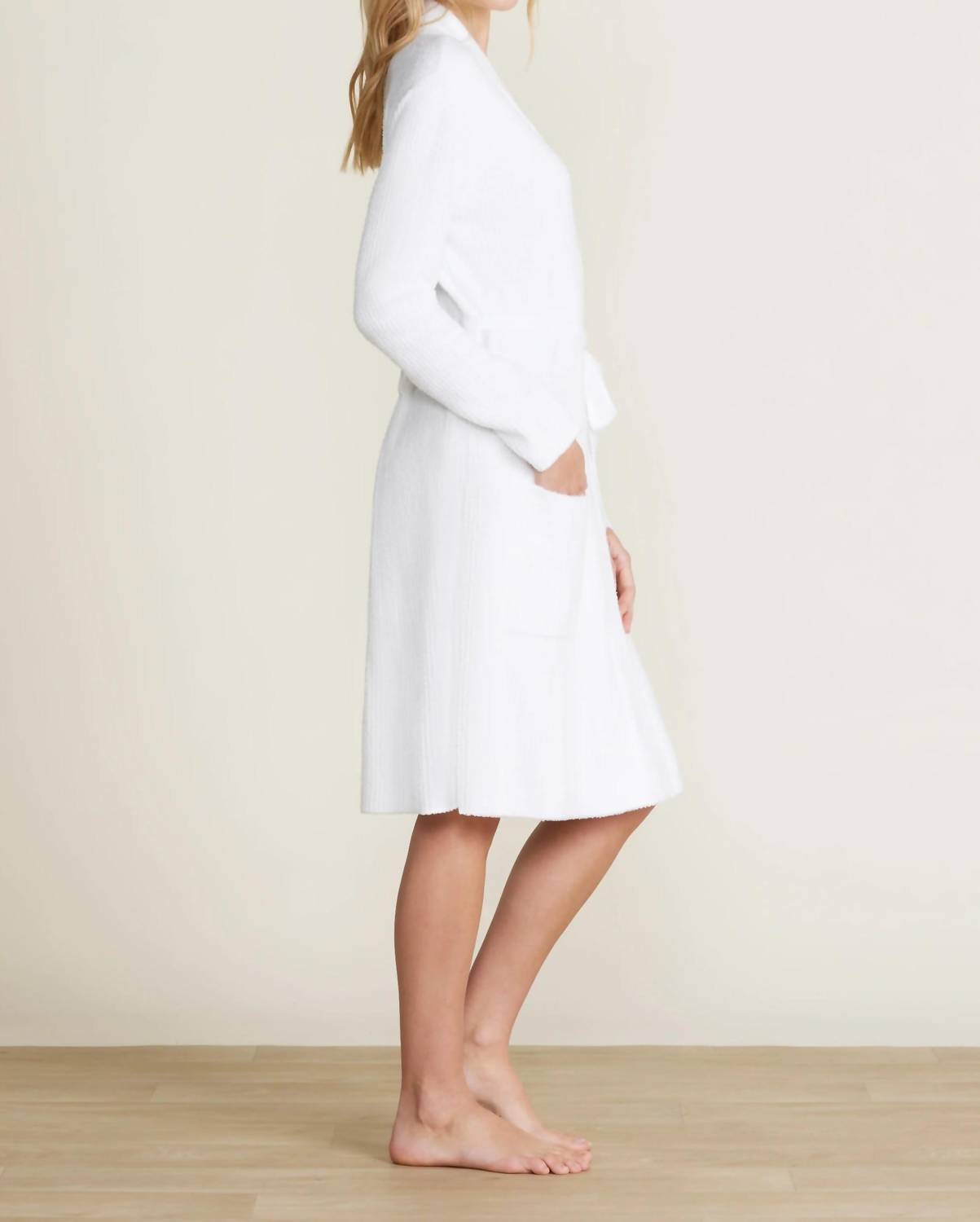 The perfect piece to lounge in, sleep in, and cook breakfast in. Introducing the Barefoot Dreams Cozychic Lite Ribbed Robe in a serene Sea Salt shade, perfect for minimalist style lovers. This women's robe features long sleeves and a versatile fold-back shawl collar, offering the option to wrap it for extra coverage. Its engineered center back channel secures the removable belt, eliminating worries about losing it or experiencing bunching. Ideal for wearing open or closed, this robe seamlessly combines comfort and elegance, making it an excellent choice for a Thanksgiving dinner party.