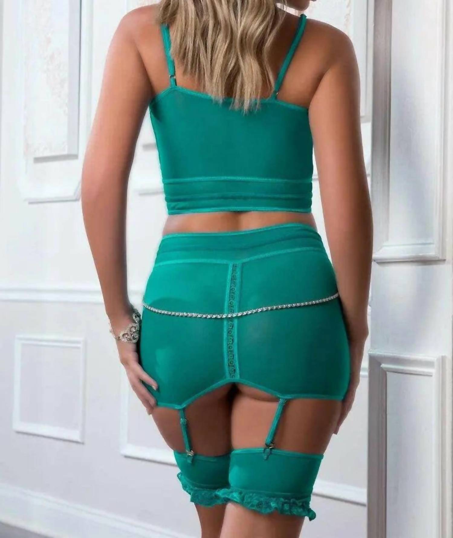 Enhance your allure with the Defining Bustier & Garter Skirt Set by G World Collection, a teal turquoise masterpiece perfect for those special occasions. This long line bustier features sumptuous floral lace and embroidery, complemented by a pearled chain accentuating the body's curves. An open front zipper detail adds an edgy touch, while velour strapping and a high-rise cut define and enhance your shape. Complete with a matching garter skirt in sheer mesh and lace trim, this set is a full-coverage triumph in alluring 90s fashion.