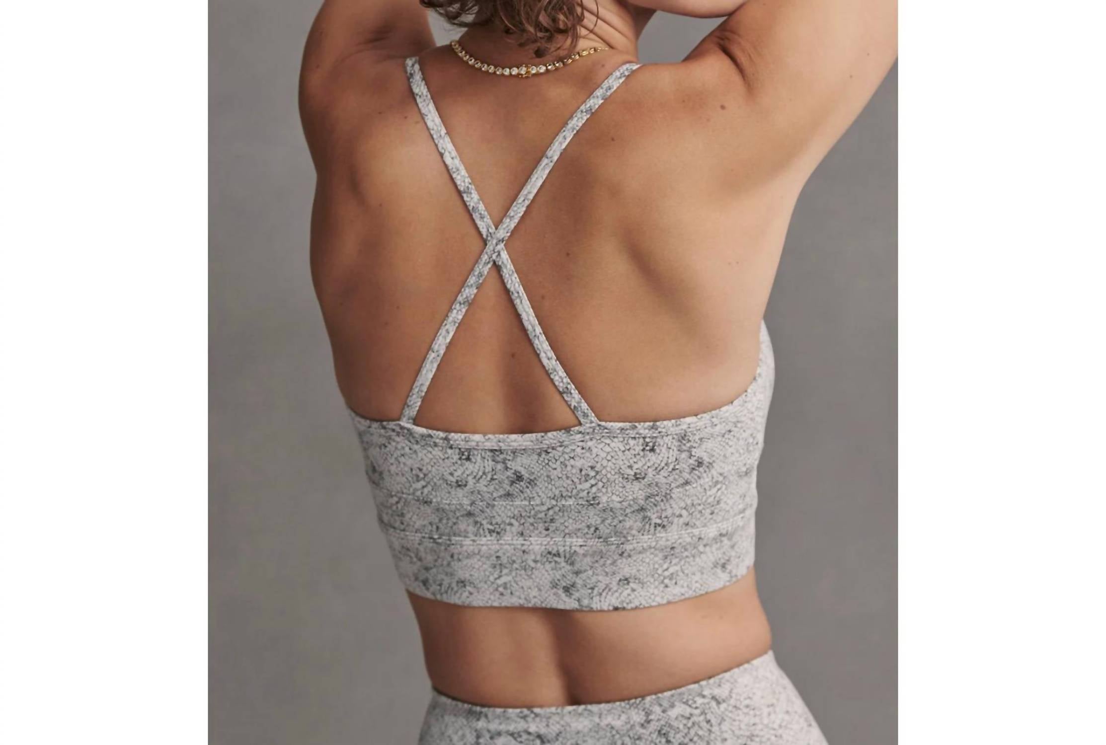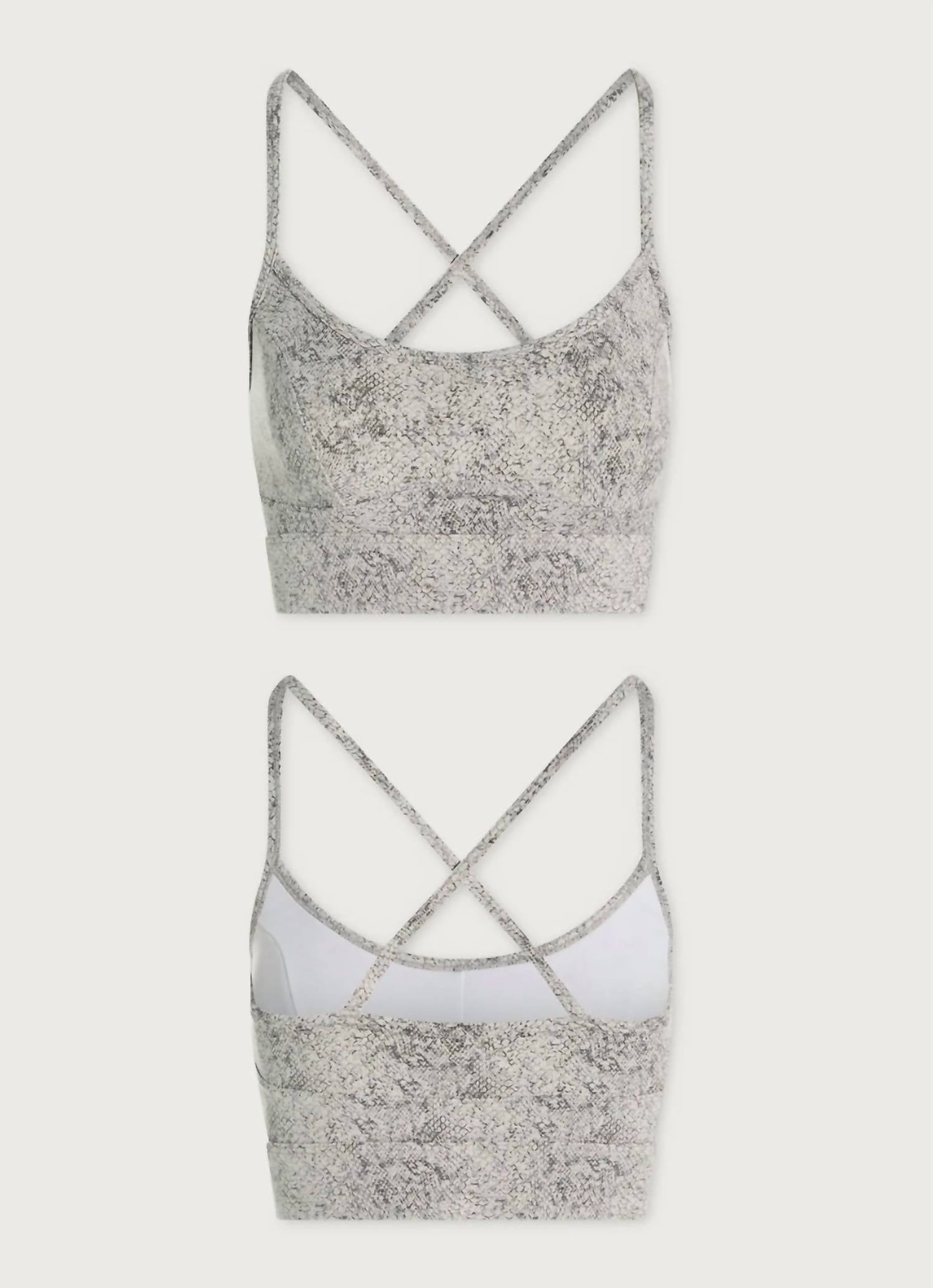 A sports bra that has it all - style, function and support. The Move Irena Bra by VARLEY in Ivory Textured Snake is the perfect blend of comfort and performance, designed for active women. Made from 75% recycled polyester and 25% elastane, this sports bra offers excellent moisture management and breathability in a buttery soft, non-padded design. Care: Machine wash cool with like colors, do not bleach; hang or lay flat to dry. Pair it with matching pants available in the same luxurious fabric for a complete workout ensemble.