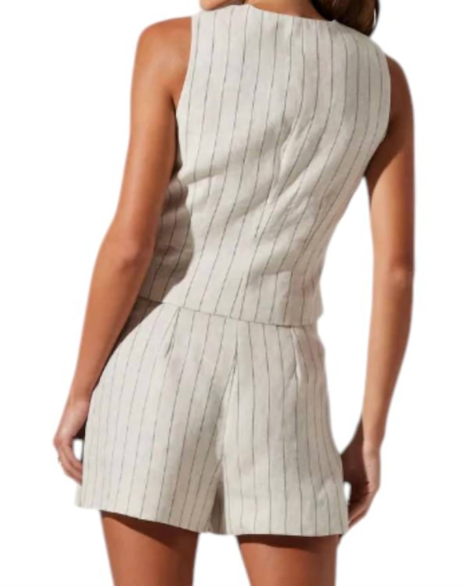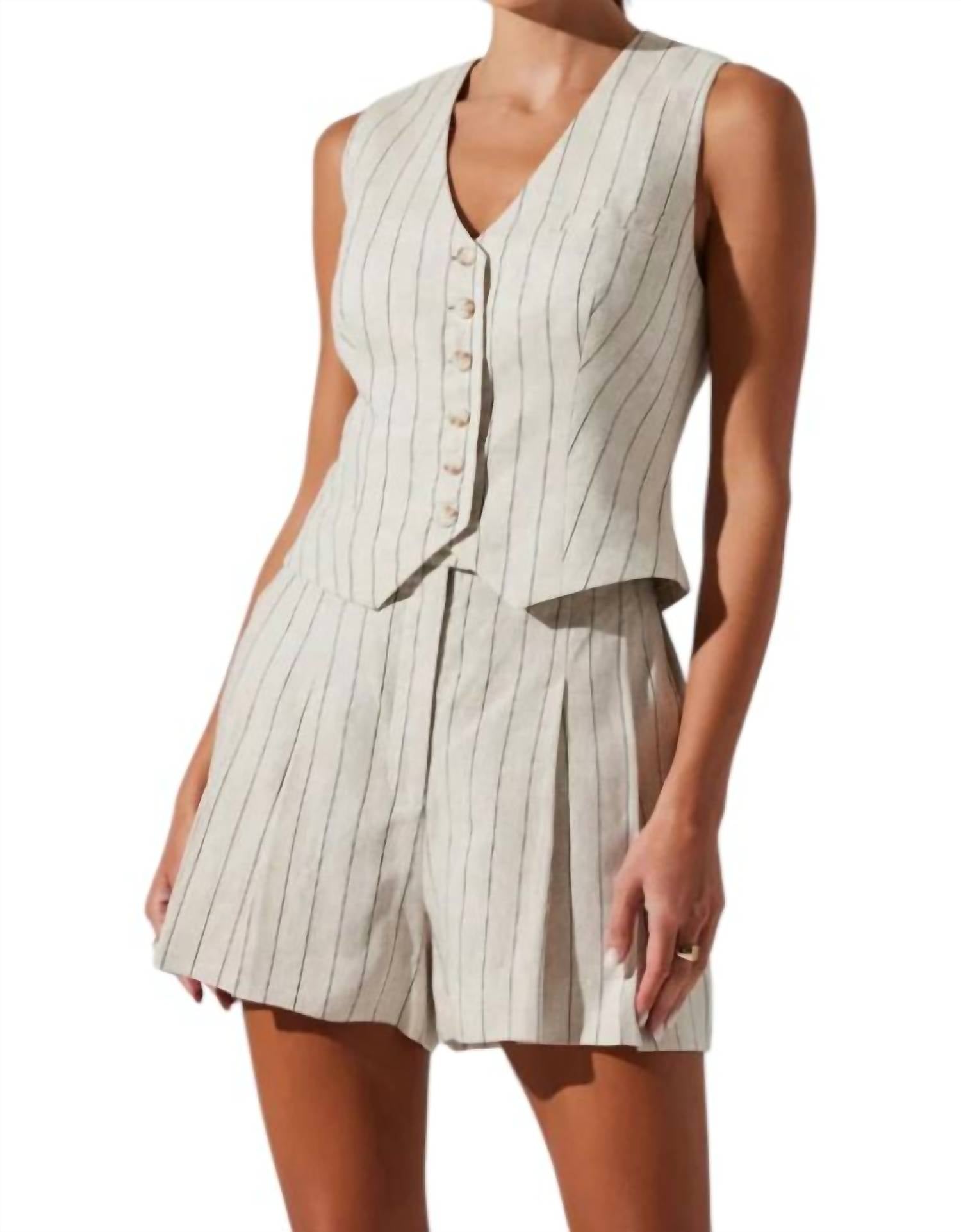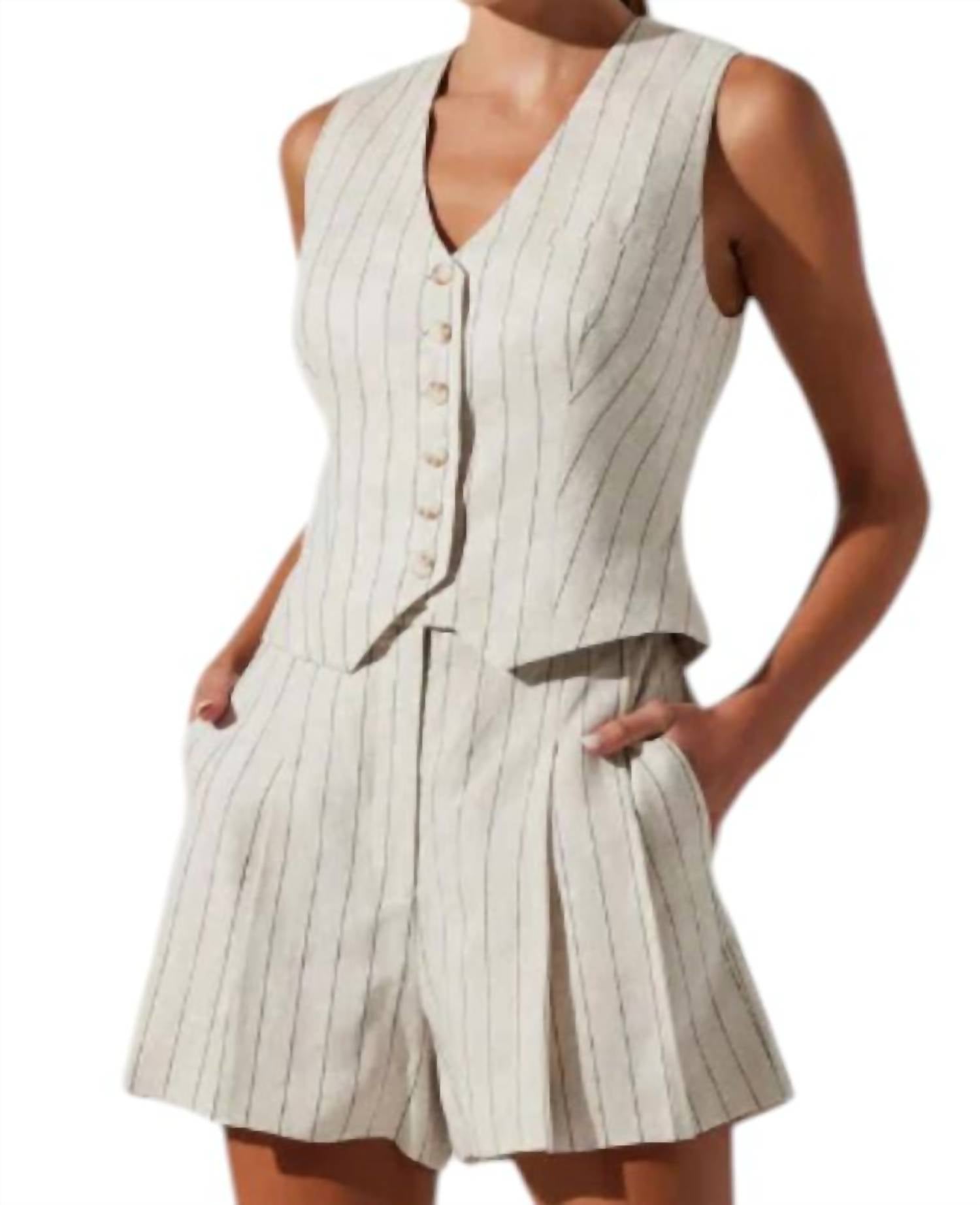 Perfect sleeveless vest flaunts a chic menswear-inspired design with clean pinstripes and a flattering V-neck. Crafted with a composition of 100% linen for the exterior and lined with 100% cotton for added comfort. Featuring a button front closure and a functional front pocket.