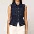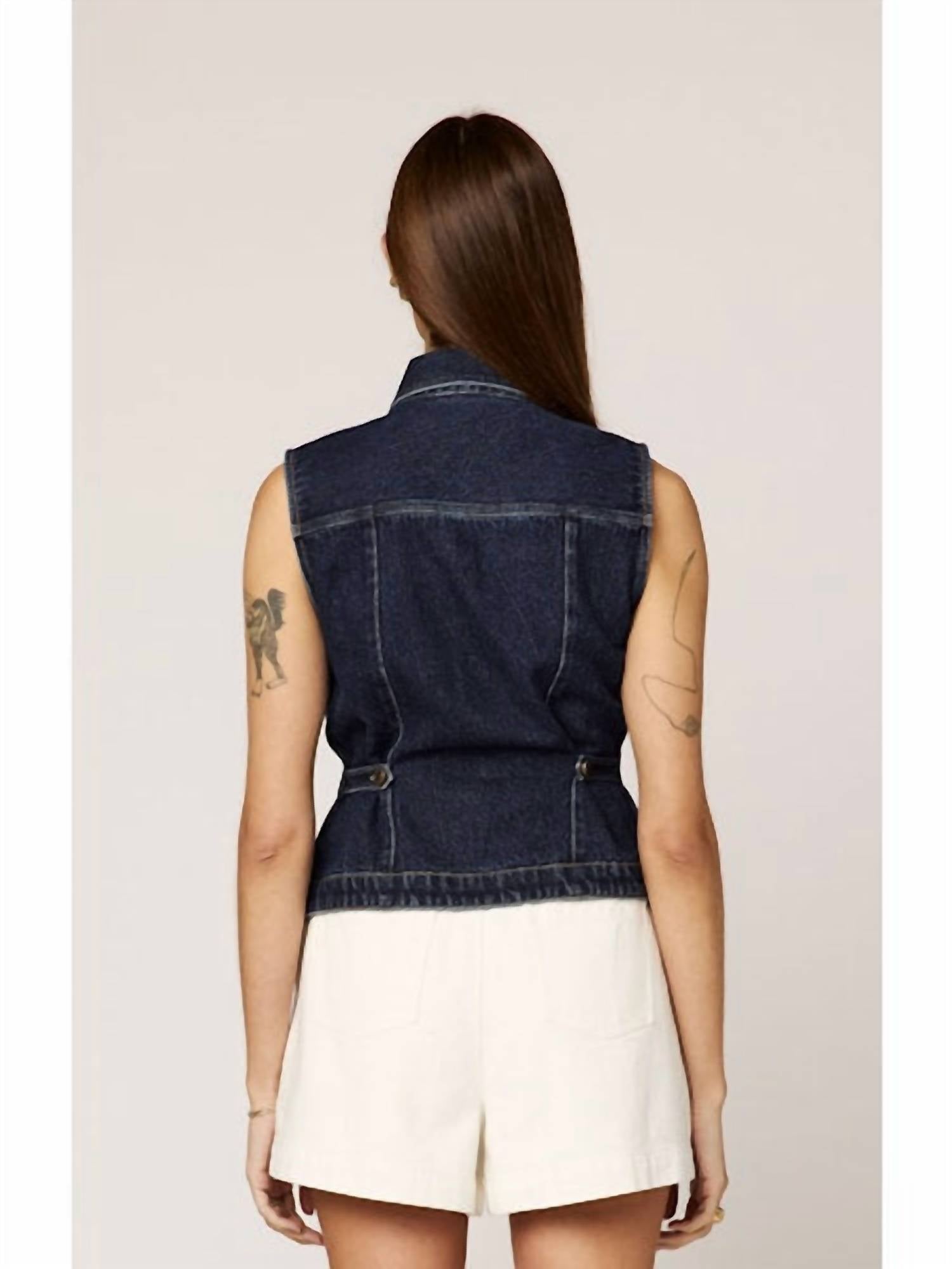 The Women's Franka Vest by Cleobella is an ideal choice for boho chic enthusiasts. This sleeveless vest is made from 100% cotton denim, featuring a button closure and classic collar in a rich dark denim wash. Perfect for layering during spring vacation, it includes functional pockets for added practicality. Made in an undisclosed location, this piece embodies a relaxed fit with textured detail for versatile styling.