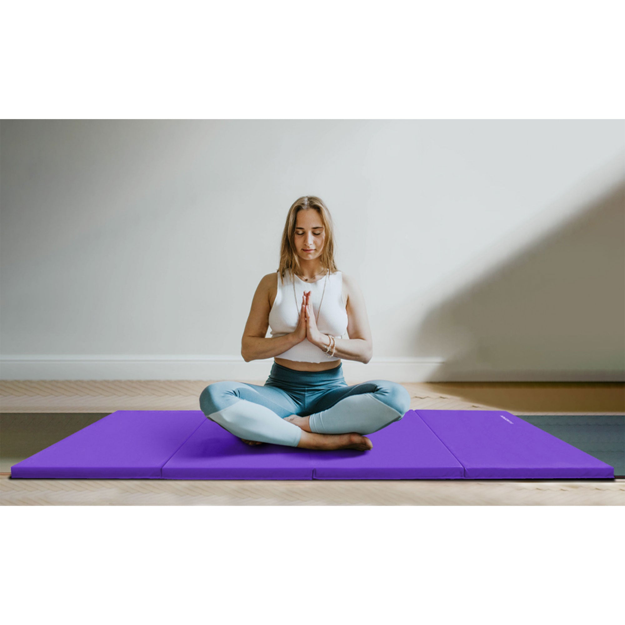 Made from high-density vinyl, this 2-inch thick floor mat with a carefully stitched design comfortably cushions your spine, hips, knees, and elbows on hard floors. The double-sided, slip-resistant surface helps prevent injury and keeps the mat securely in place. Featuring moisture-wicking technology, this workout mat repeals any sweat or spilled liquids that could cause a stained surface. When the time comes for cleaning, simply rub down the surface with warm water and soap. The mat's foldable, 4-panel design makes transporting from the studio or gym to your home a breeze. Attached Velcro carrying straps also come in handy when juggling keys, phones, and drinks all in the same hand.
