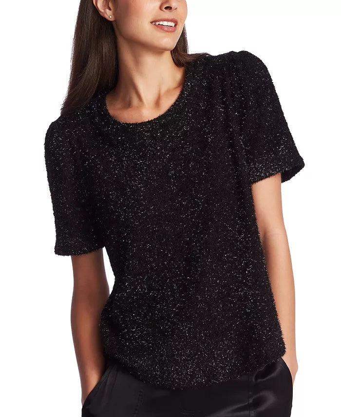 Approx. 24-1/2" long|Crew neck|Eyelash styling throughout with metallic detailing; slightly puffed shoulders|Polyester|Machine washable|Imported