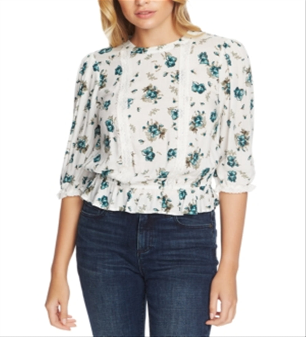 1.STATE Women's Floral-Print Lace-Inset Top Ivory Multi Size Small