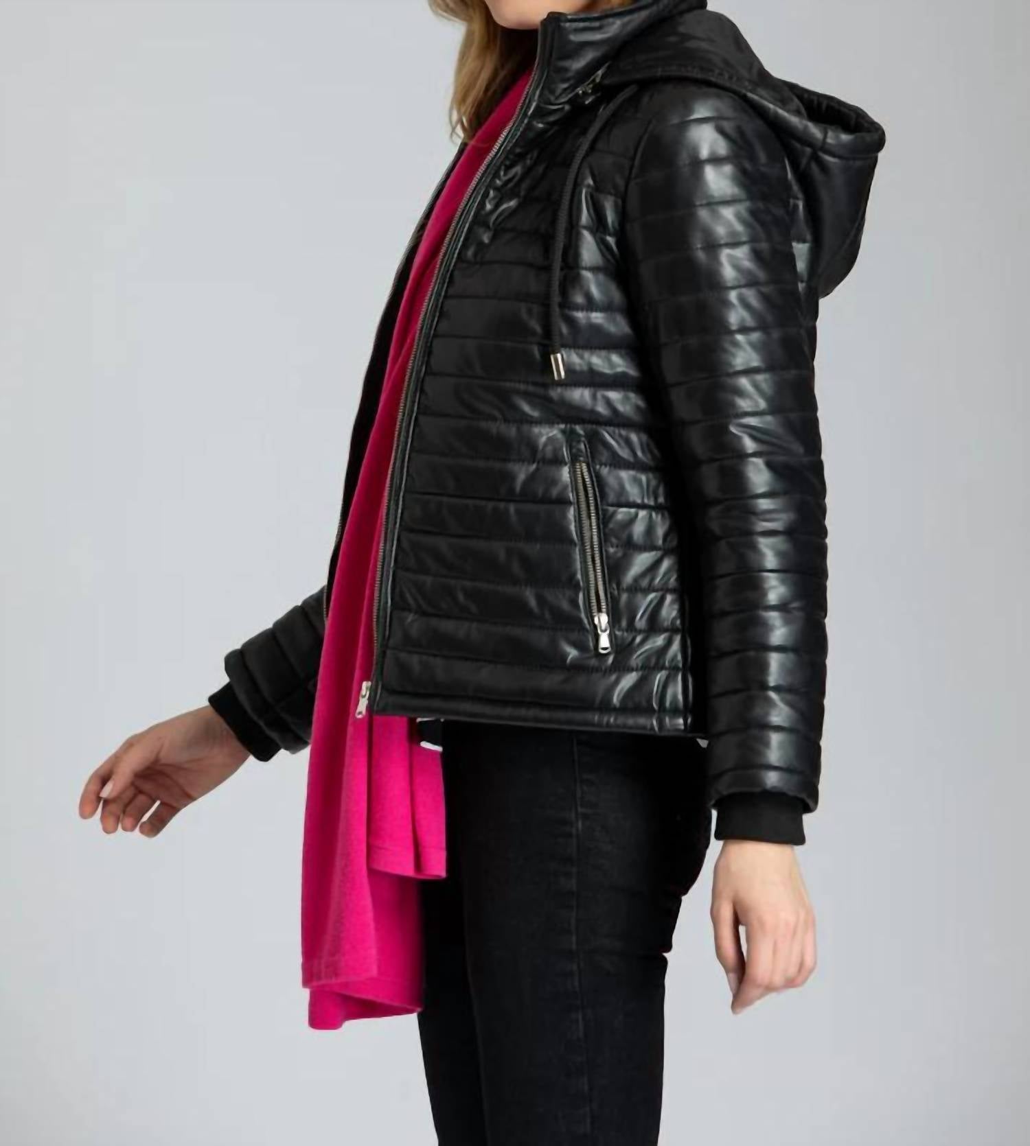 The 11 Uptown Puffer Leather Jacket in Black is crafted to keep you warm with its luxurious lamb leather and long sleeves, offering both style and functionality. Designed with a zip closure, this jacket features a detachable hood for versatile weather adaptability, perfect for the colder seasons. Its solid pattern and sophisticated design make it an essential addition to any winter wardrobe. Model is 5'9" and is wearing a size S.
