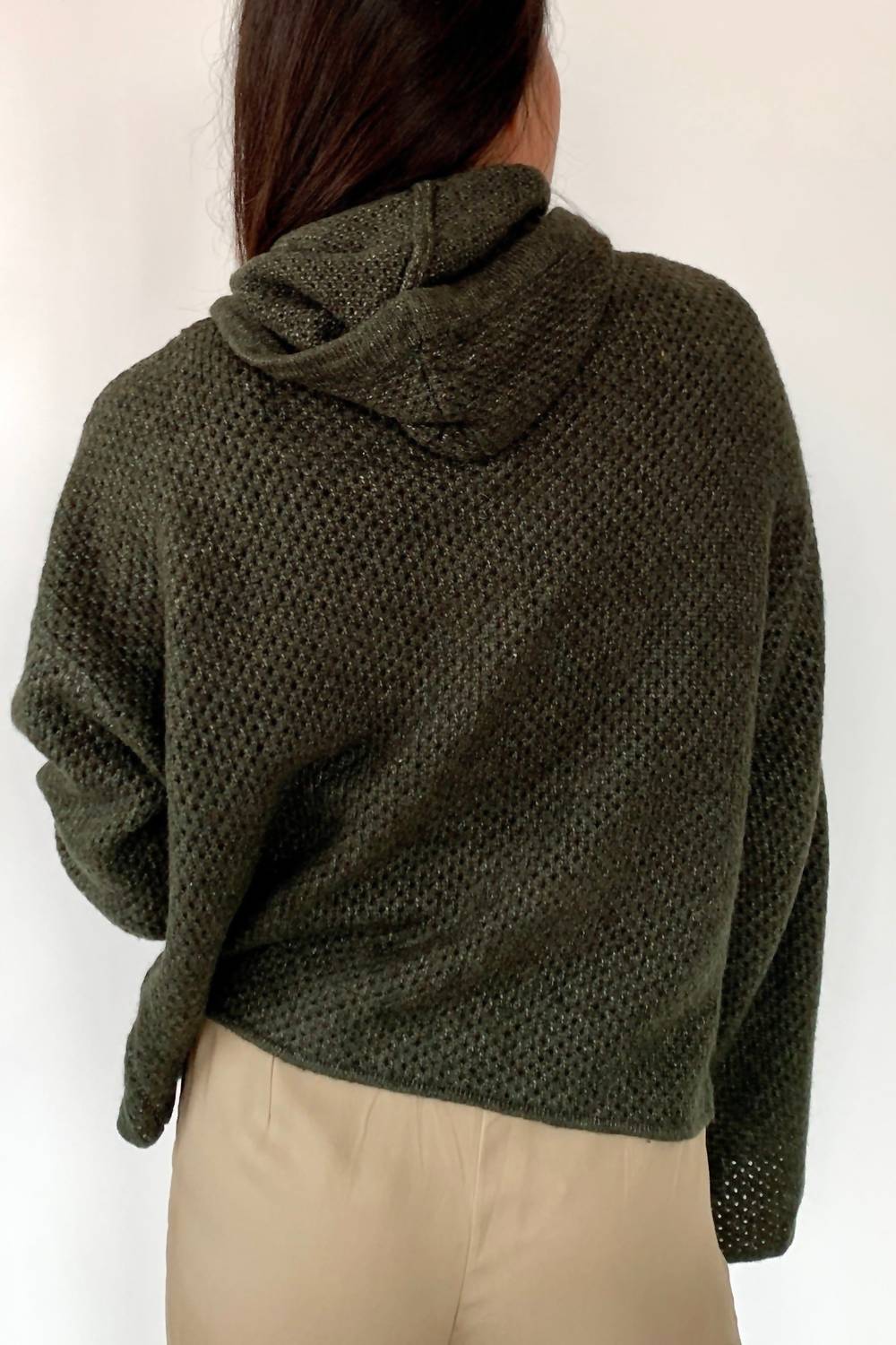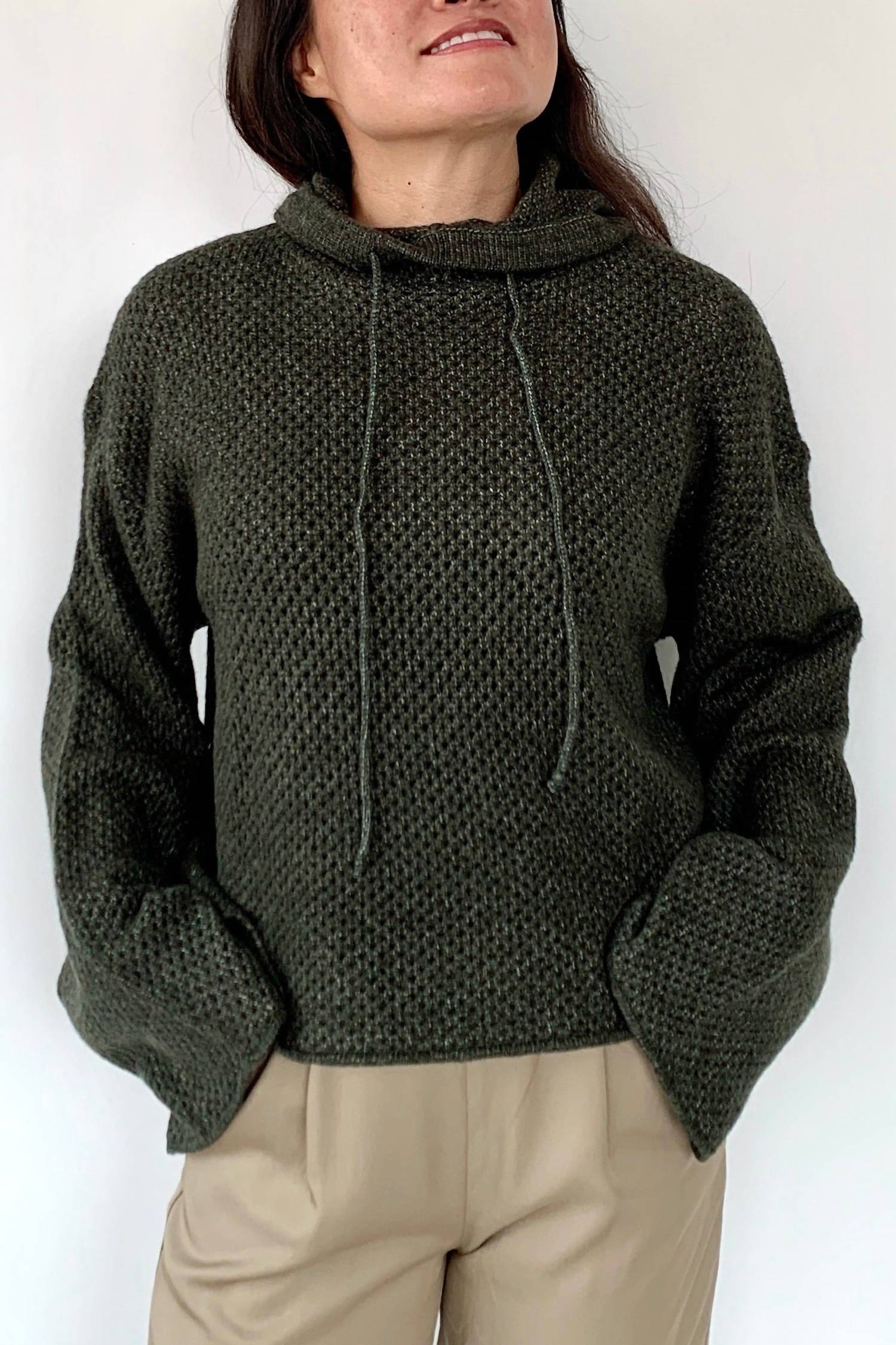 Introducing the Cozy At Home Knit Hoodie by 124 Voltaire, perfect for versatile styling in the colder months. With long sleeves and a textured pattern, this dark-colored hoodie is ideal for lounging or dining out. Made with a pull-on design, it's crafted to be layered as desired without any closures. Designed for women, this piece is perfect for winter occasions, whether you're heading to church or cozying up at home.