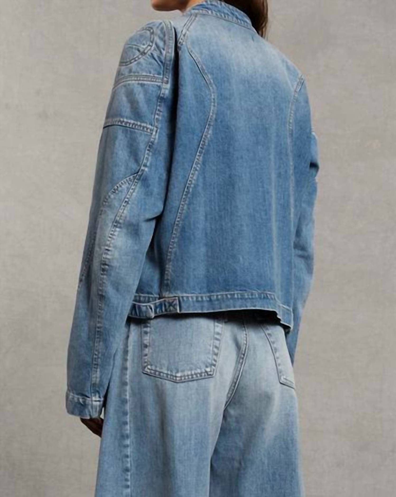 Throw this adorable jacket over just about anything for an effortlessly stylish look. Elevate your summer wardrobe with the 3x1 Biker Denim Jacket, a chic addition in Ciel Blue. Featuring long sleeves and crafted from 100% cotton, this jacket offers a solid, true-to-size fit for effortless vacation styling. It includes a convenient snap closure and exemplifies the nostalgia of 90s fashion. Made in Italy, care is easy with machine wash cold inside out and line dry instructions.