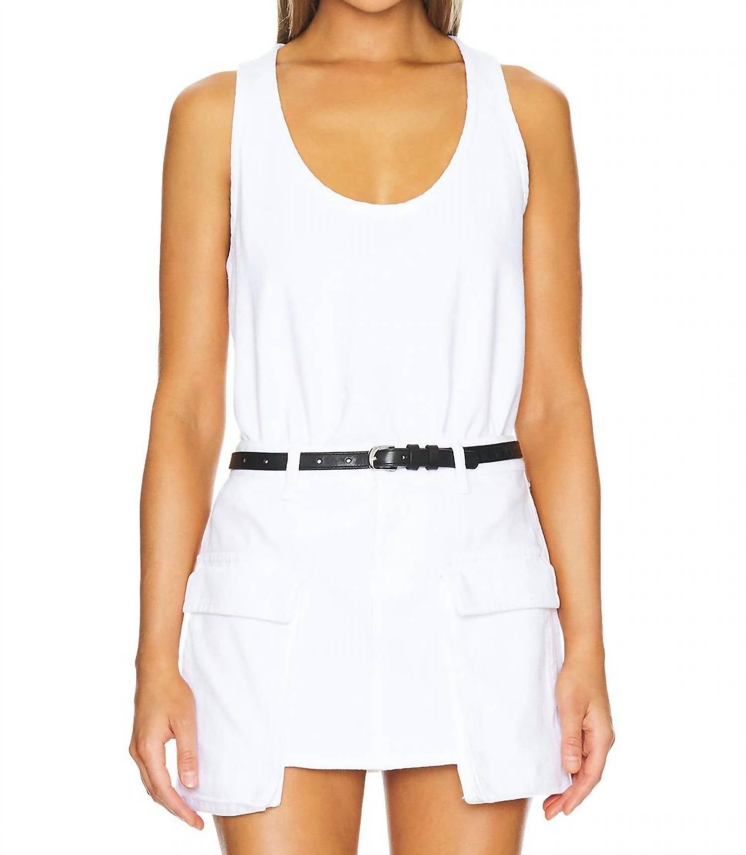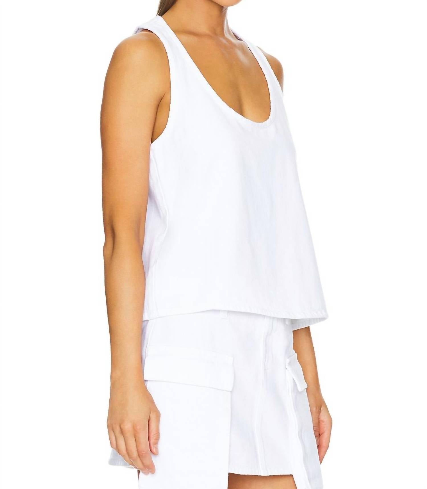 The perfect tank top for those warmer weather seasons. Embrace easy-chic styling with the Moon Top by 3x1, a staple in the brand's lineup of women's tank tops. This sleeveless piece is crafted from a buttery-soft 10-ounce denim canvas in a pure Blanc hue, making it perfect for spring days. Composition: 100% Cotton, with a pull-on closure. Made in Italy, this solid pattern top boasts machine wash convenience and a flattering scoopneck design. Model is wearing size S.