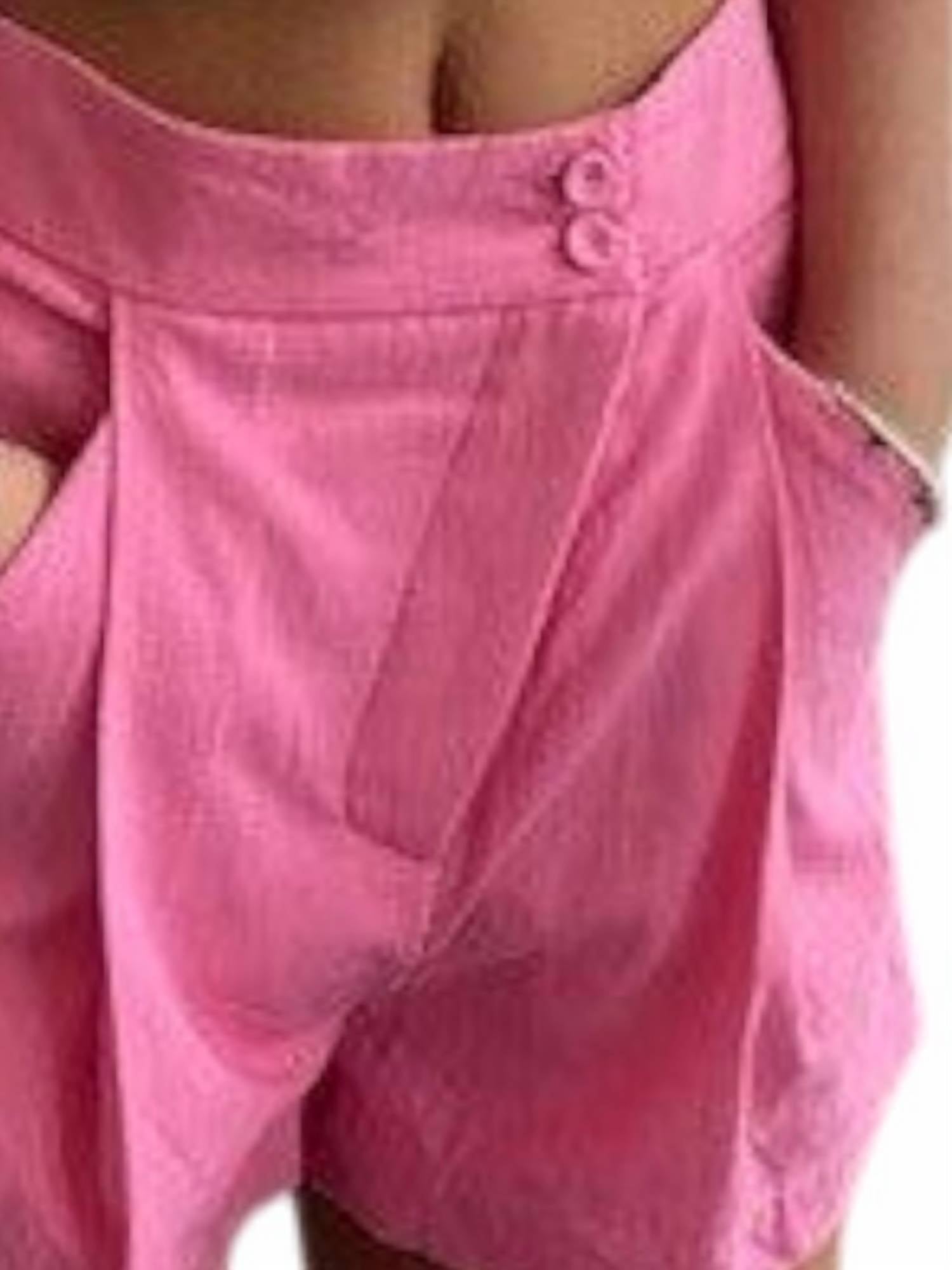 Introducing the Women's High Rise Short by 4SI3NNA, designed for a bold and contemporary look. These solid pink high-rise shorts feature an eye-catching asymmetrical front and convenient pocket details, perfect for summer vacations or a Valentine's Day outing. With a sophisticated button closure, they bring subtle elegance to any ensemble. Ideal for those embracing 90s fashion trends, these shorts blend style and comfort effortlessly.