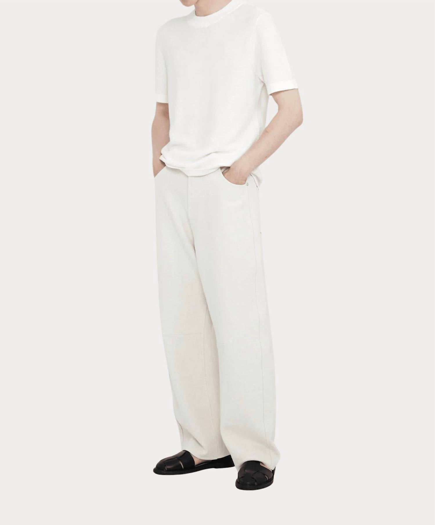 Introducing the Relaxed Curve Legged Trouser in Off-White by 7115 by Szeki, a perfect minimalist piece for your wardrobe. Featuring a relaxed fit, these trousers boast a pronounced curved leg silhouette and an extended rise, allowing for versatile styling at either mid or high waist. Crafted from 100% cotton, they come equipped with a practical button fly closure and belt loops for functionality. Made in Guangzhou City, China, these trousers can be maintained with either hand or machine wash cold and should be dried flat or dry cleaned.