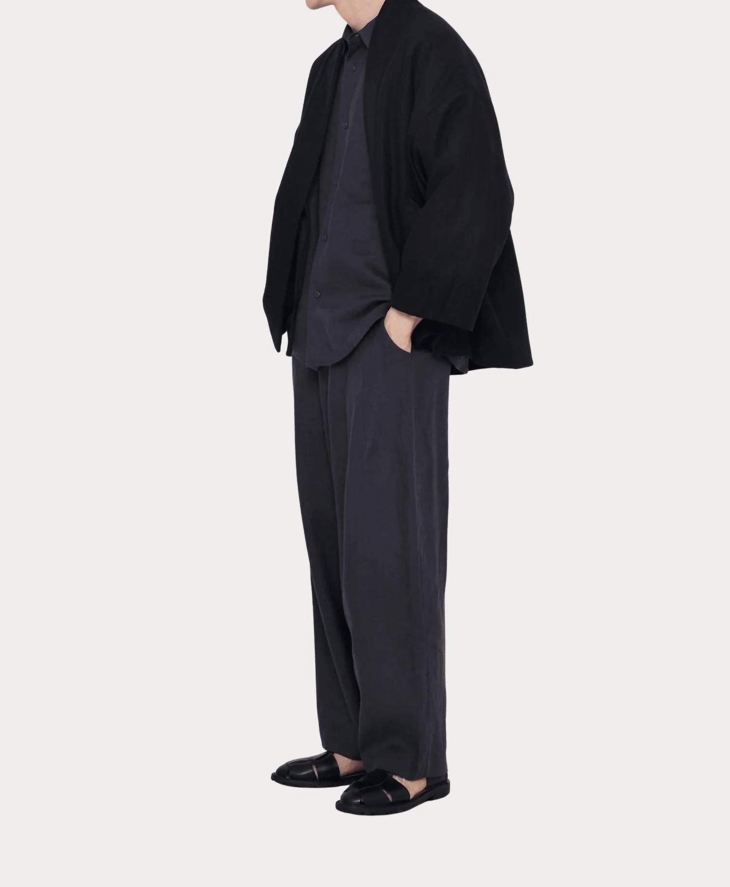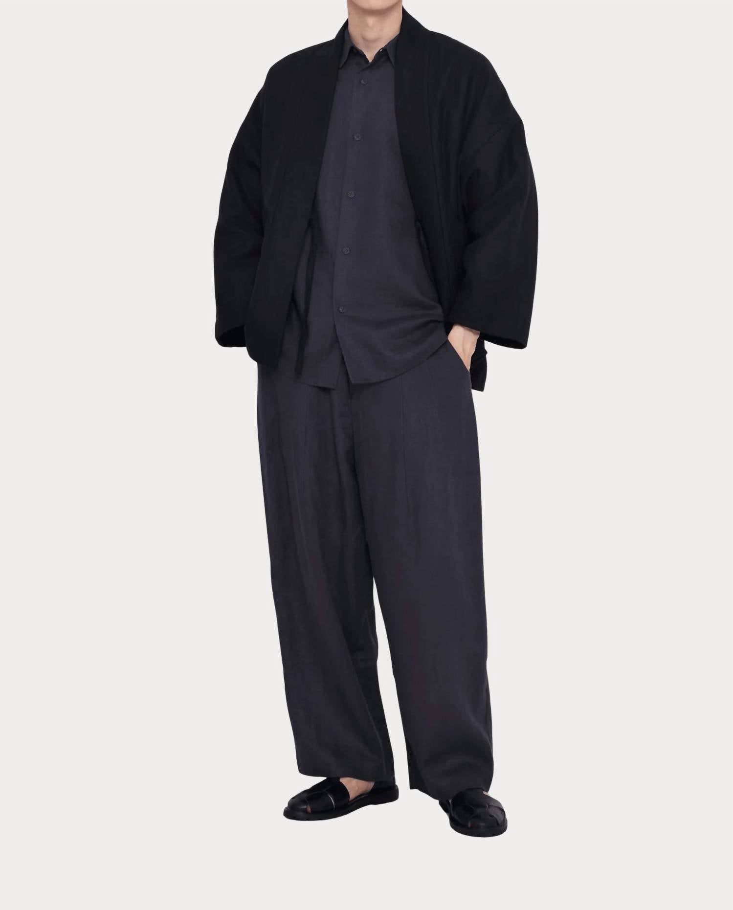 Introducing the Reversible Quilted Jacket by 7115 by SZEKI, a minimalist staple in sleek black. This jacket features long sleeves and is beautifully crafted with Side A made from 65% cotton and 35% linen, while Side B boasts 100% soft cotton. Its reversible design highlights versatility, offering a cocoon silhouette with a tie closure. Made in Guangzhou City, China, this collarless jacket requires hand or machine wash in cold water and should be dried flat or dry cleaned.