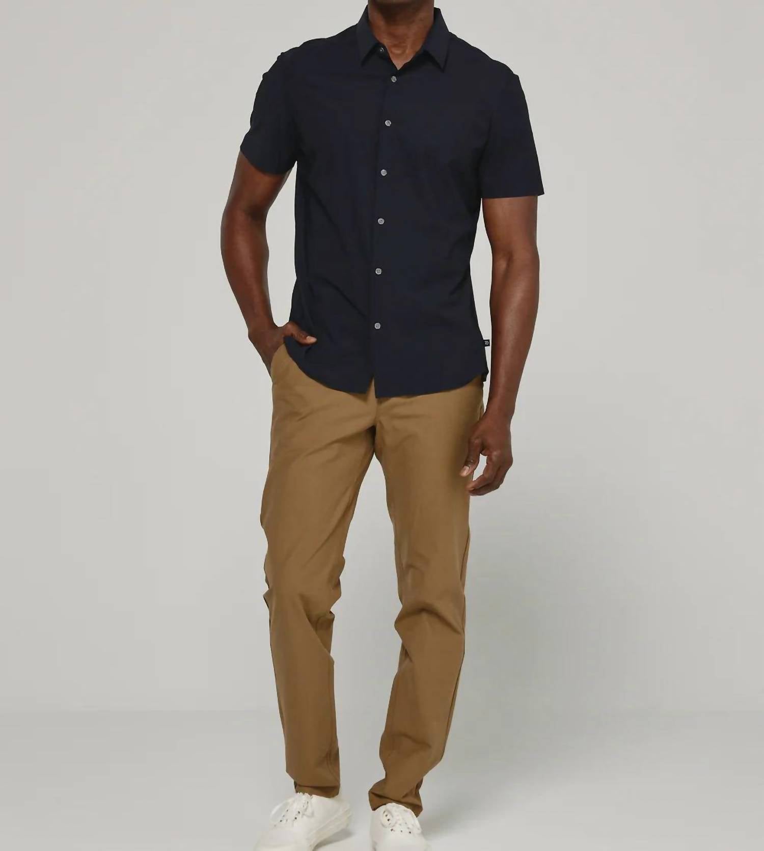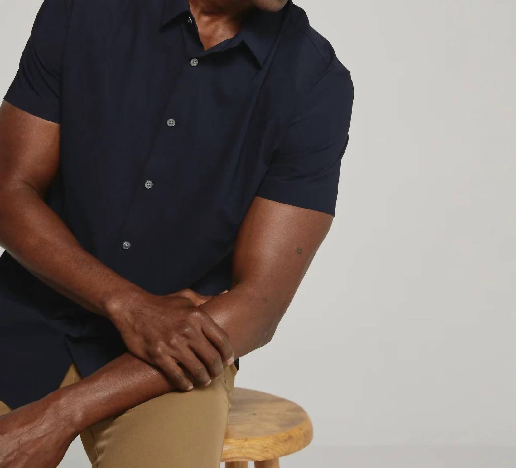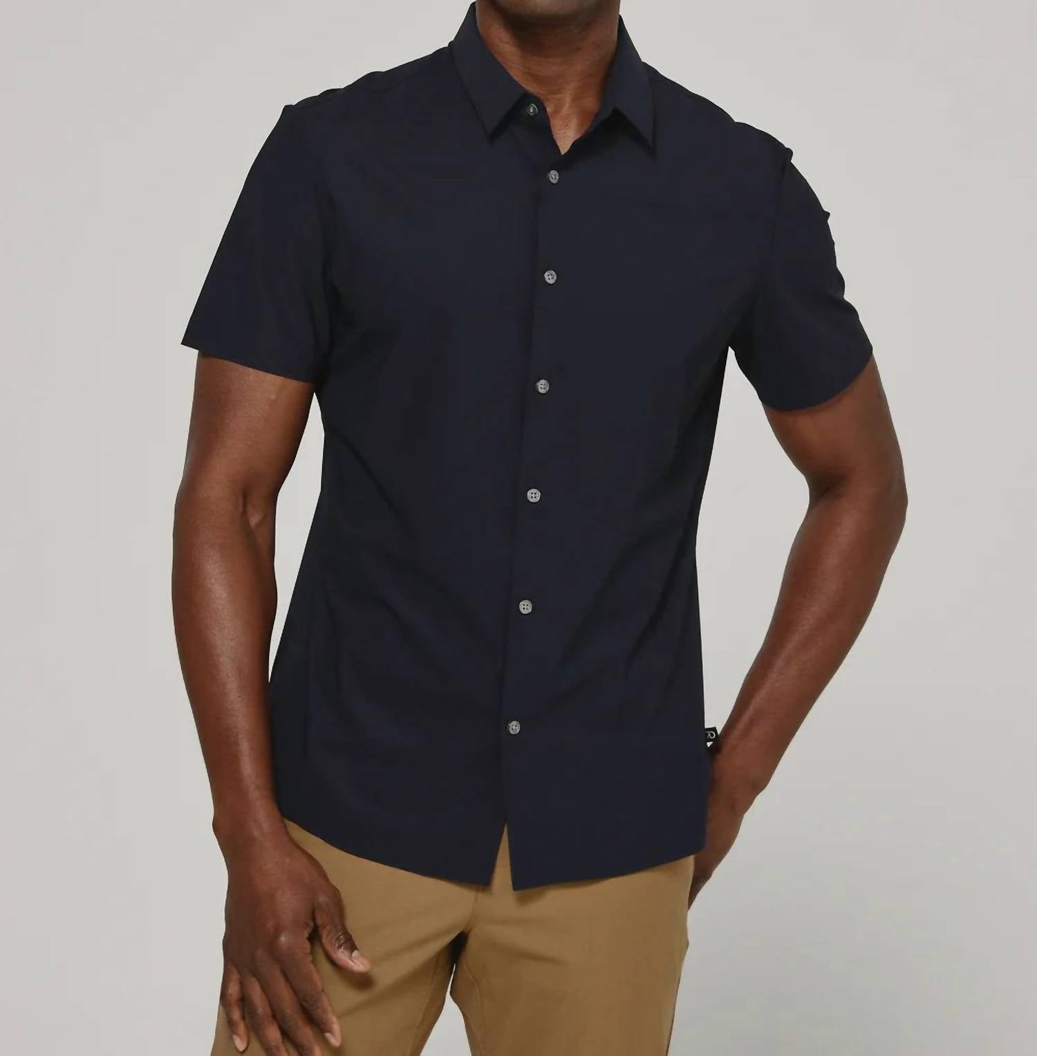Presenting the American Me Short Sleeve Shirt by 7Diamonds, a must-have for any dinner party or Thanksgiving gathering. Crafted with a composition of 78% Nylon and 22% Spandex, this solid navy shirt offers a smooth and sleek fit that enhances movement and comfort. The shirt features a classic collar and a convenient button closure, showcasing minimalist design perfect for spring occasions. For lasting quality, machine wash cold on delicate, lay flat to dry, and avoid ironing or dry cleaning. Model is 6'1" and is wearing a size medium.