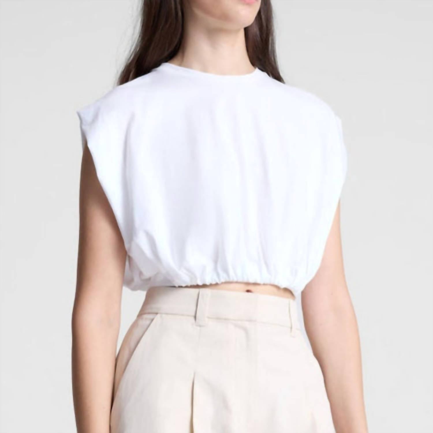 Meet the Billie Sleeveless Tee by A.L.C., an essential piece in crisp white designed to elevate your style. This cropped silhouette with a length of 17" features a bold voluminous cap sleeve and a gathered elastic hem. Made from 100% cotton, it ensures comfort and quality. Closure: Back keyhole. Care: Machine wash and line dry. Model is 5'9.5" and wears a size S (Bust 31", Waist 24", Hips 36").