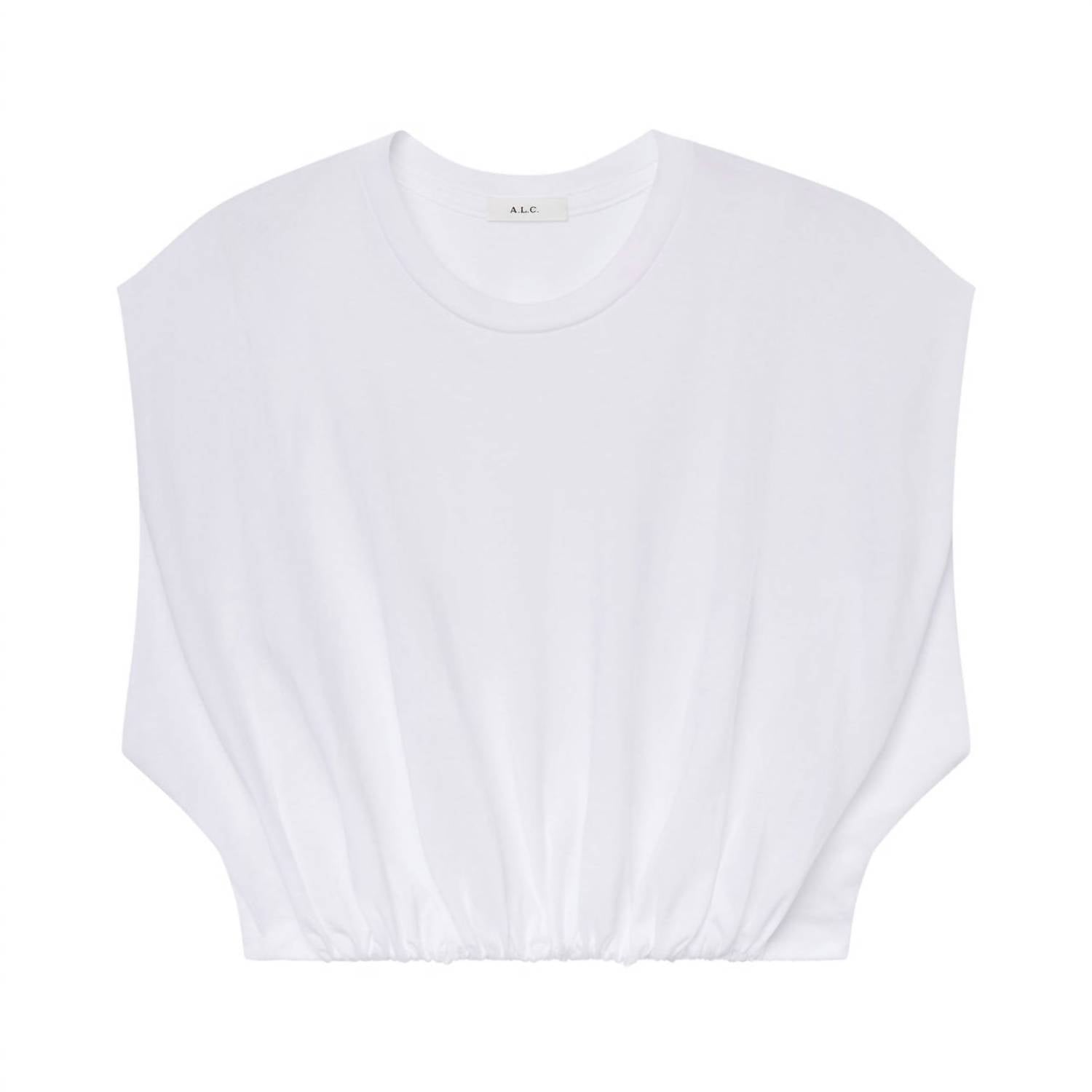 The short sleeve tee you'll want in every color. Meet the Billie Sleeveless Tee by A.L.C., an essential piece in crisp white designed to elevate your style. This cropped silhouette with a length of 17" features a bold voluminous cap sleeve and a gathered elastic hem. Made from 100% cotton, it ensures comfort and quality. Closure: Back keyhole. Care: Machine wash and line dry. Model is 5'9.5" and wears a size S (Bust 31", Waist 24", Hips 36").