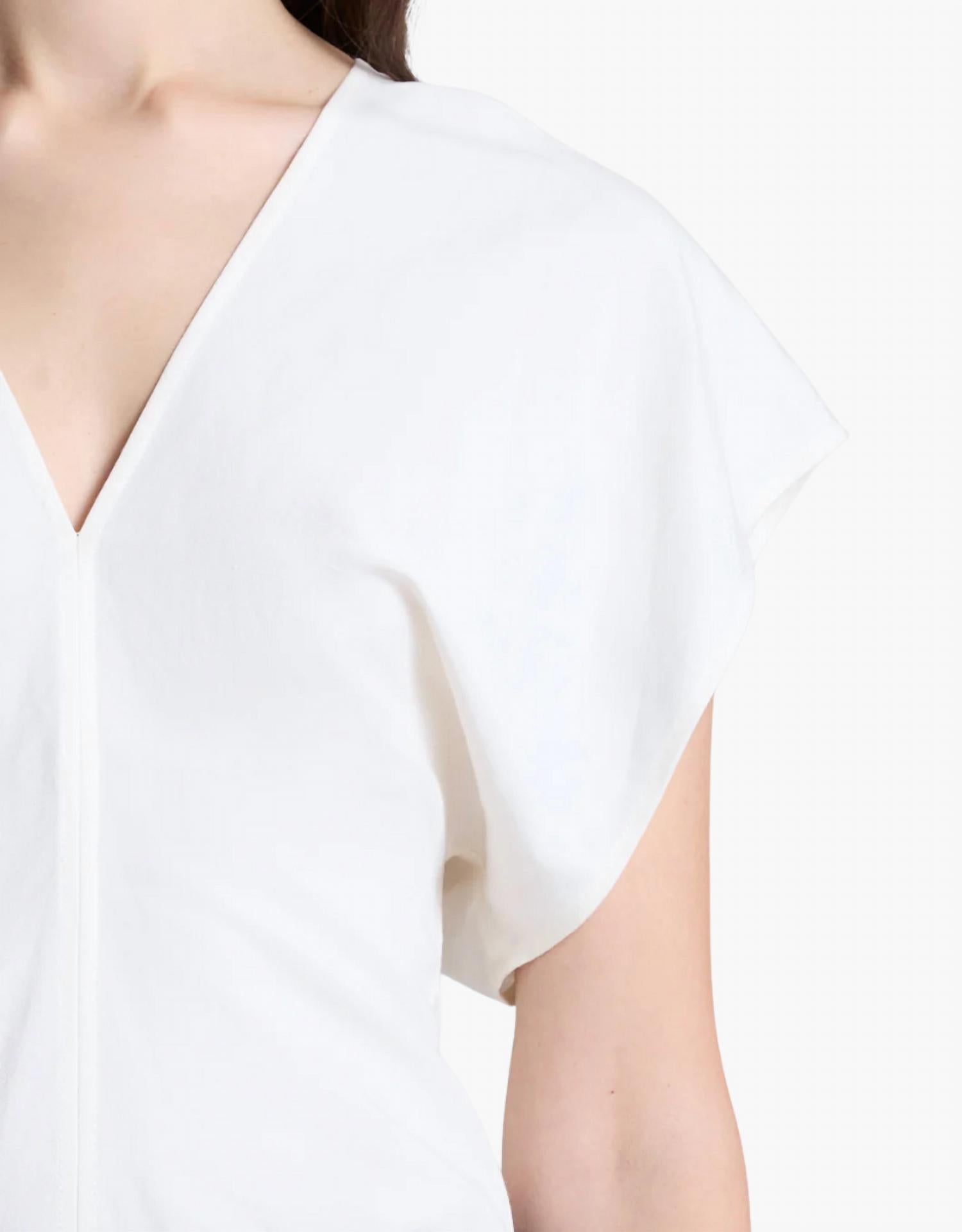 Introducing the Fay Linen Top by A.L.C., an elegant piece effortlessly crafted in a luxurious cream hue. This top is made from a blend of 76% Viscose and 24% Linen, offering a natural drape and soft touch. Designed with short flutter sleeves and a striking V-neckline, it features a sleek zip closure at the back for a contemporary look. Garment Length: 24.75". Care: Dry Clean. Model is wearing size 4 (5'9.5" height).