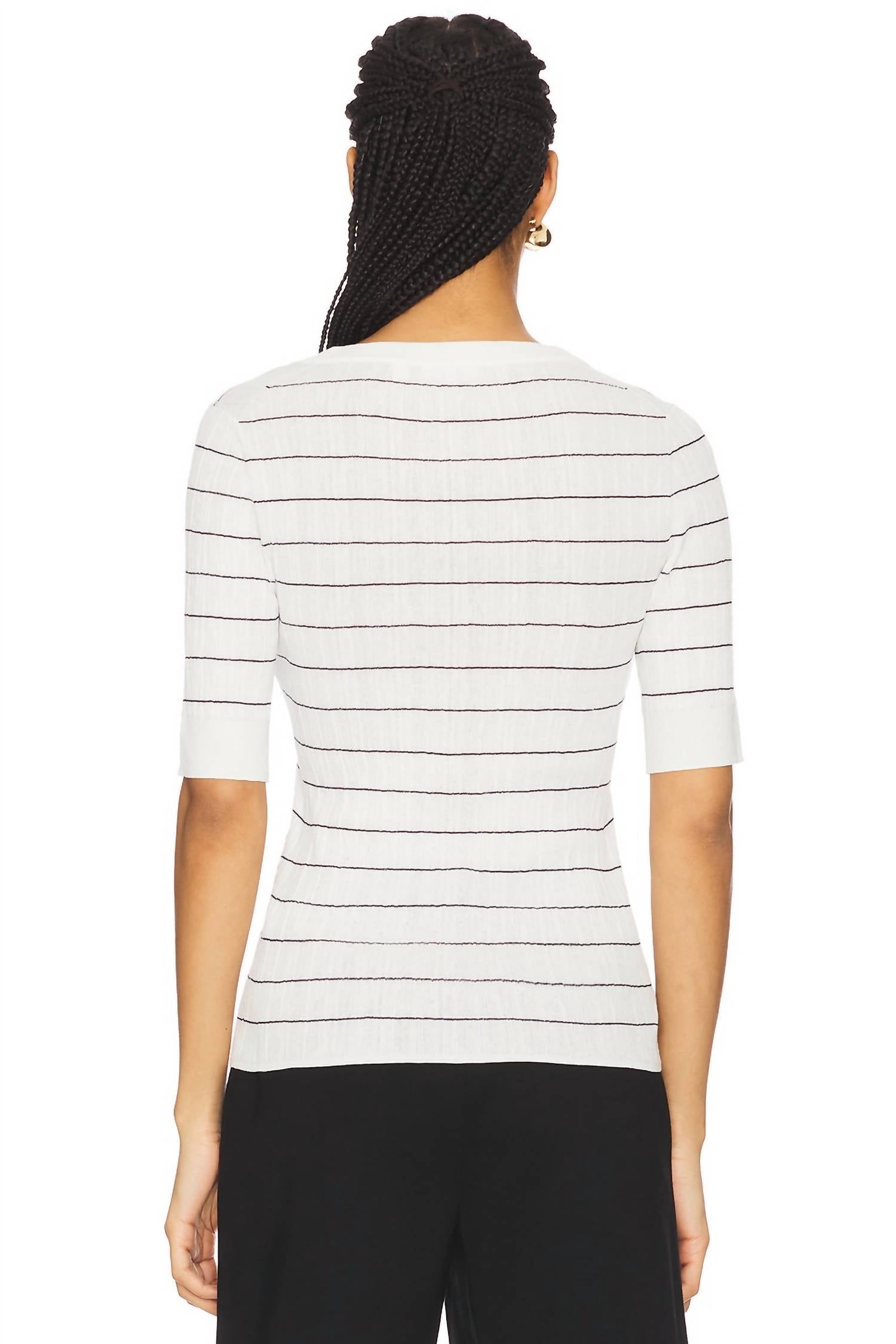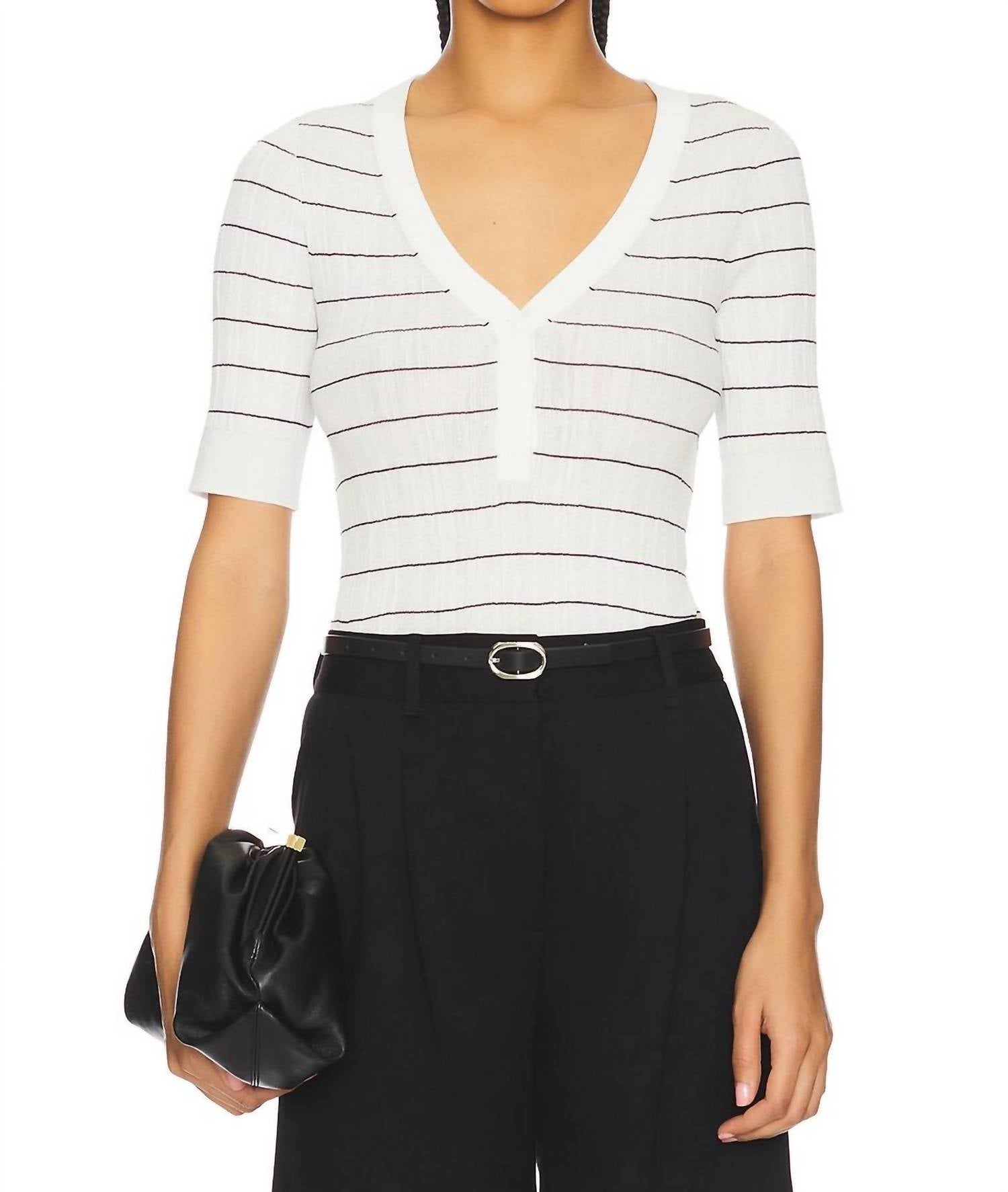 This classic, short sleeve tee will be your go-to staple this season and beyond. Elevate your wardrobe with the A.L.C. Francis Top, a perfect blend of style and comfort in bright white and navy stripes. Crafted from a cotton blend, this lightweight knit features a short sleeve design and a sophisticated V-neckline. Composition: 78% cotton, 22% nylon. Origin: Made in China. Closure: Partial front button closure. Care: Dry clean only.