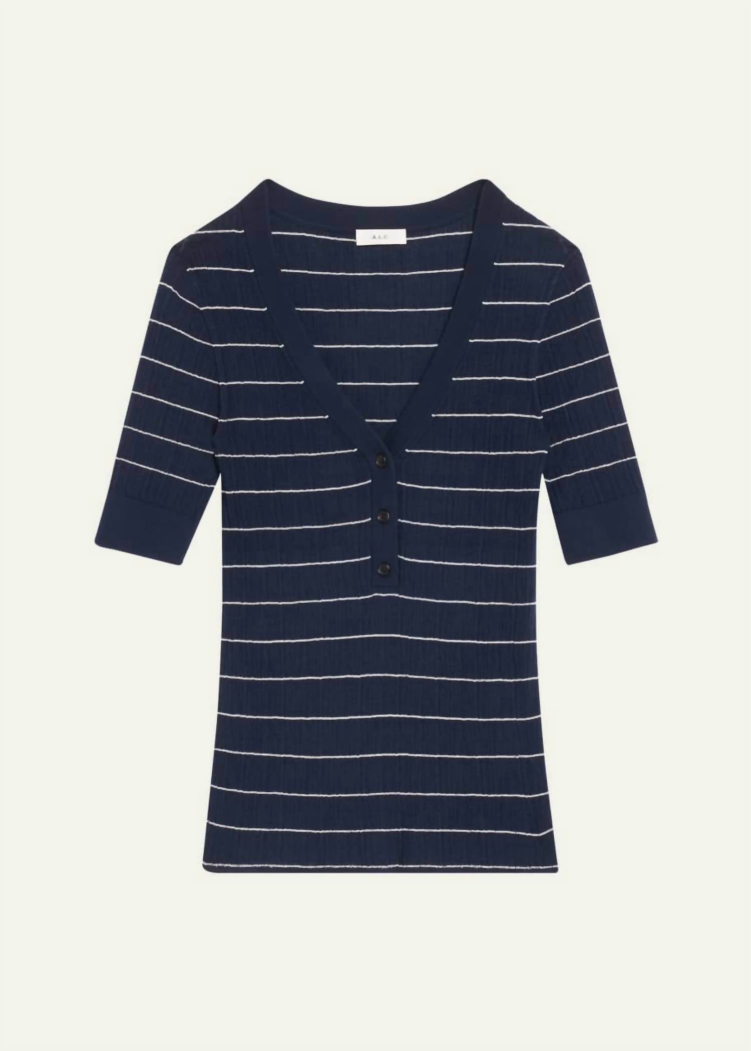 This classic, short sleeve tee will be your go-to staple this season and beyond. Elevate your wardrobe with the Francis V Neck Top by A.L.C., a perfect blend of style and comfort in navy and bright white stripes. This short sleeve piece in a cotton blend features a chic V-neck and a streamlined fit with button closure, making it ideal for any dinner party or spring occasion. Composition: 78% Cotton, 22% Nylon. Garment Length: 23.5 inches.