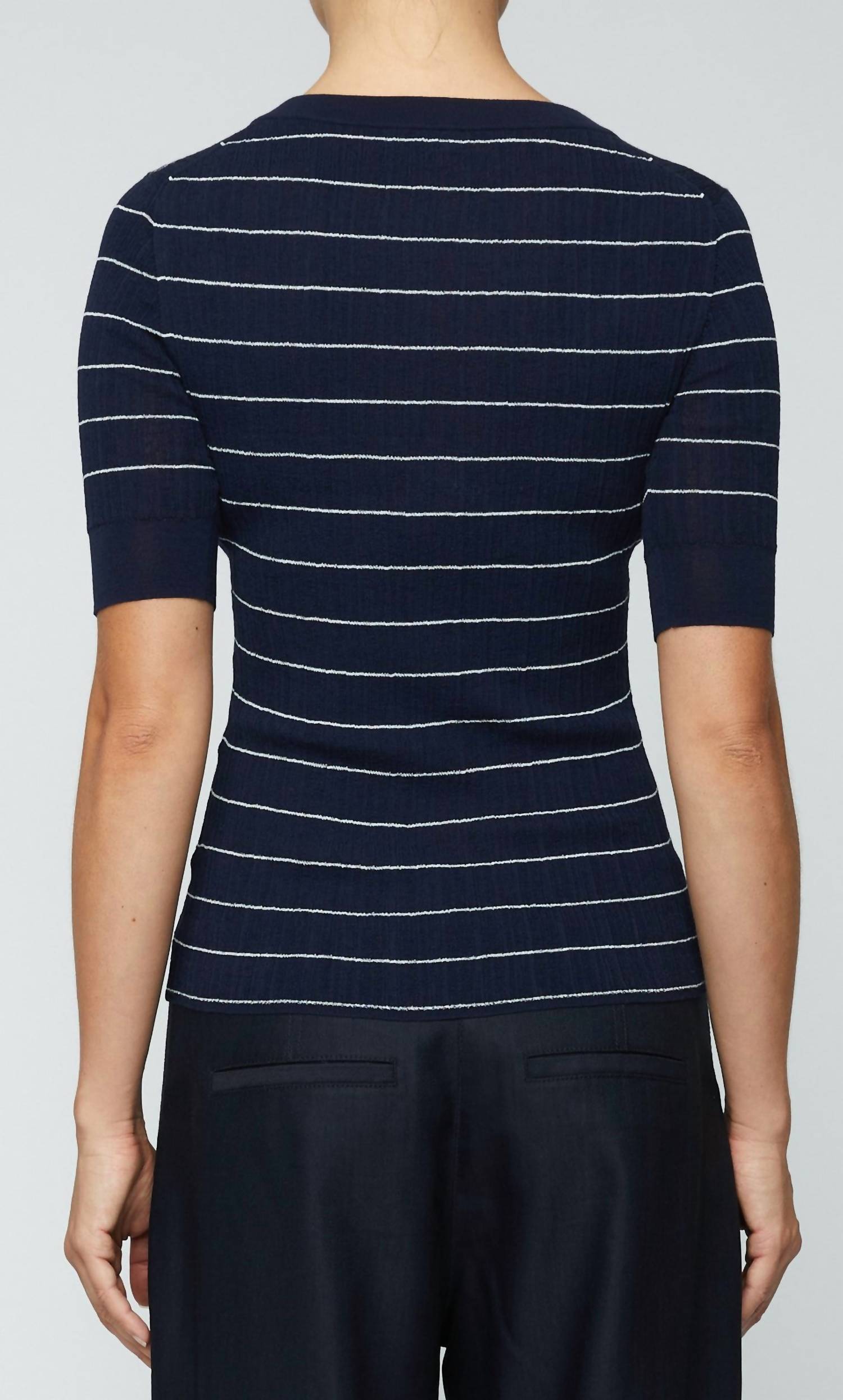 Elevate your wardrobe with the Francis V Neck Top by A.L.C., a perfect blend of style and comfort in navy and bright white stripes. This short sleeve piece in a cotton blend features a chic V-neck and a streamlined fit with button closure, making it ideal for any dinner party or spring occasion. Composition: 78% Cotton, 22% Nylon. Garment Length: 23.5 inches.