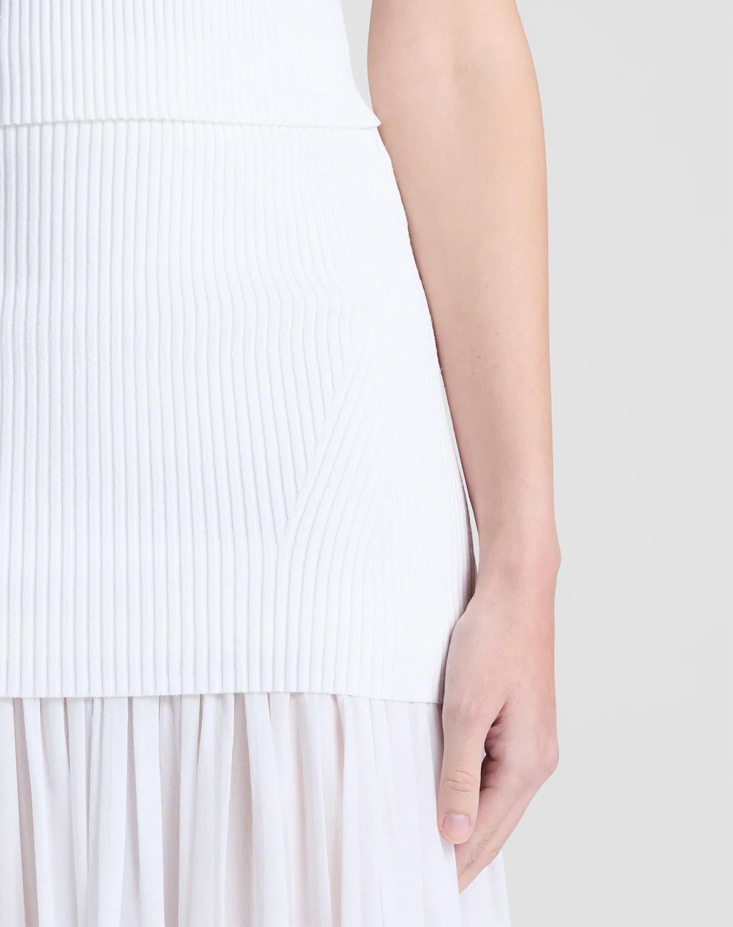 Show off just the right amount of skin in this beautifuly designed midi length skirt. Introducing the A.L.C. Hayden Knit Chiffon Skirt, a stylish blend of textures in a luxurious pearl hue. This exquisite midi skirt features a sleek, compact knit waistband composed of 62% Rayon, 35% Nylon, and 3% Elastane, transitioning into a voluminous, airy chiffon silhouette. Its design includes a pull-on closure and a lined interior for a seamless finish. For care, simply hand wash. The skirt measures 35.25" in length, with waist and hip measurements of 26.5" and 29" respectively for size S. Model is 5'9.5" and wearing a size S.