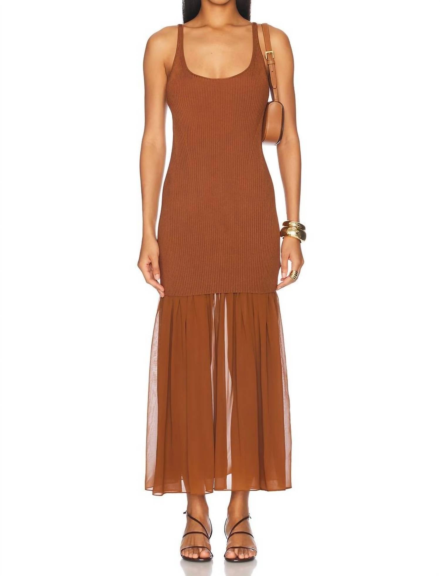 Just add slides or mules and you are good to go. Elevate your style with the Micky Dress by A.L.C., a stylish choice for your next event in a tasteful light chestnut hue. This sleeveless midi dress boasts a sophisticated sheath silhouette with a scoop neckline at both the front and back, perfect for a minimalist summer look. Crafted with 62% rayon, 35% nylon, and 3% elastane with a silk chiffon contrast and rayon lining, it offers luxurious comfort and breathability. Simply pull it on and enjoy easy elegance; to maintain its beauty, hand wash as needed. Model is wearing size S.