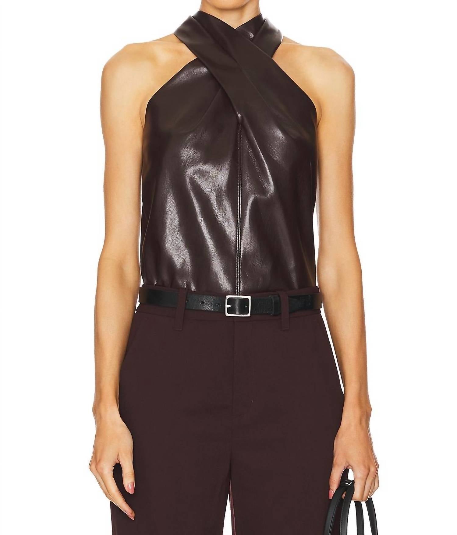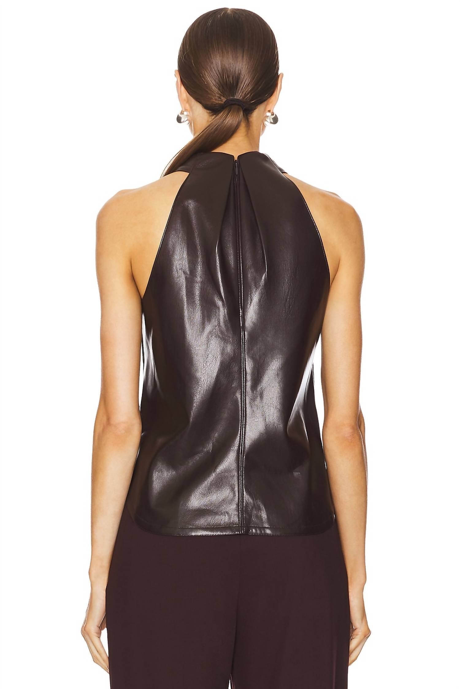 A versatile blouse that works from desk to dinner! This sleeveless blouse features a stylish halter neckline and a front crisscross detail, crafted from lightweight semi-sheen faux leather fabric. Composition includes a 100% polyester self and 100% polyurethane coating, made in China with a discreet hidden back zip closure. For care, please dry clean only.