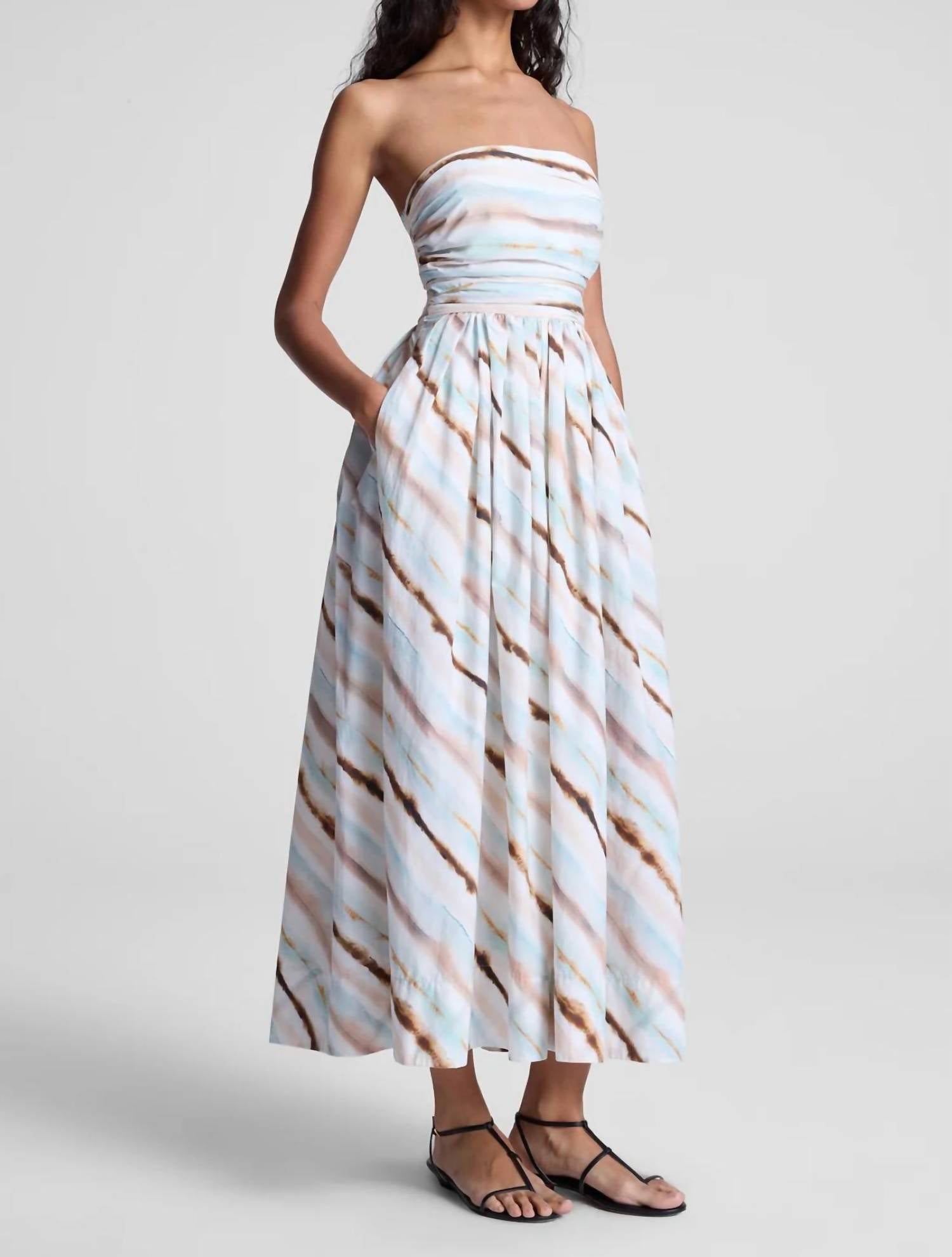 The perfect length dress does exist. Meet the Tara Dress by A.L.C., a stunning strapless piece in mint multi that will turn heads with its fluid stripe print. Crafted from 100% cotton, this A-line midi dress features a gathered bodice and a flowing skirt with discreet side pockets for added convenience. The concealed zip closure at the back offers a sleek finish. Care: Dry clean only. Length: 42". Model is 5'10" wearing a size 4 (Bust: 34", Waist: 27", Hips: 40").