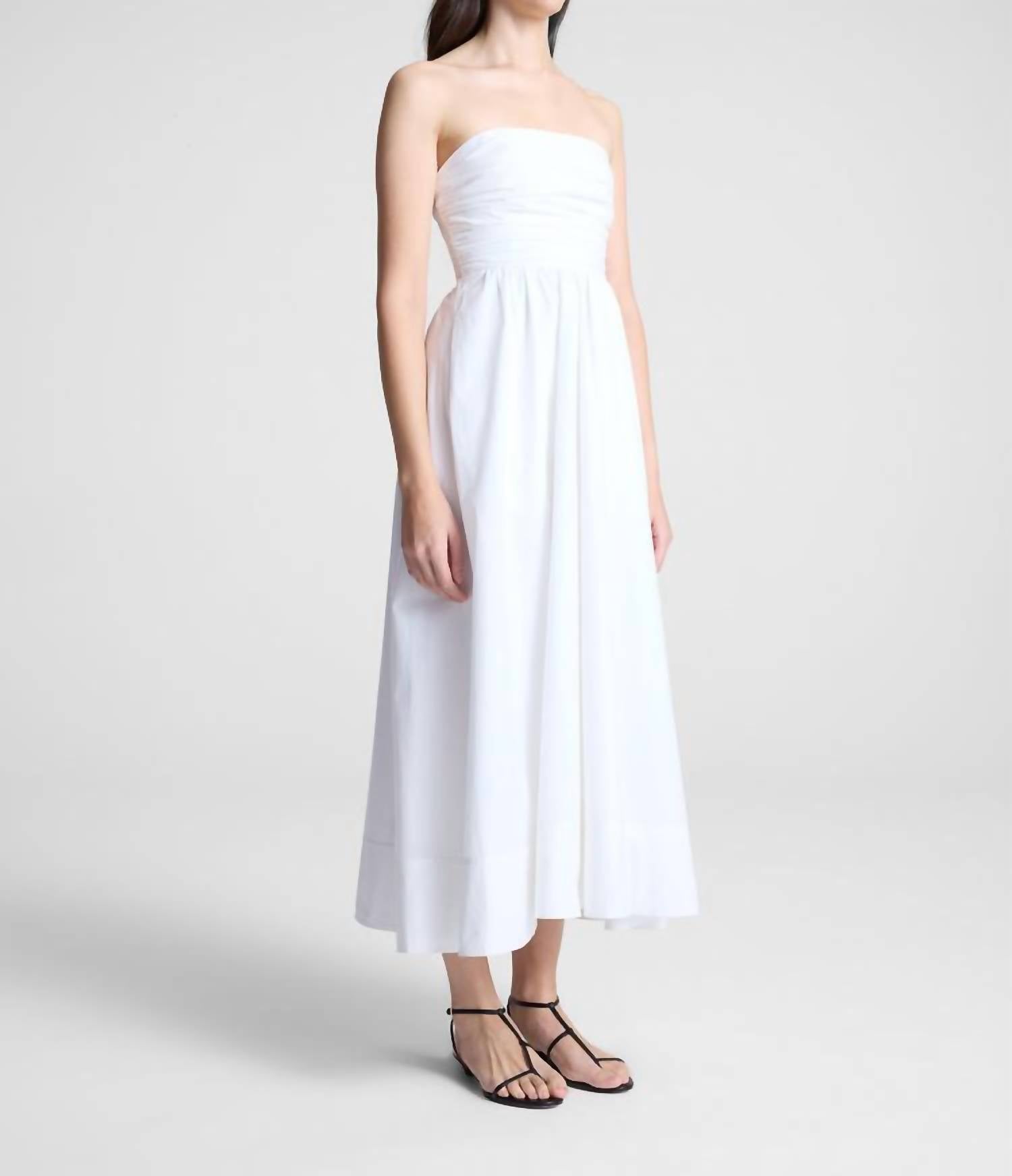 Introducing the A.L.C. Tate Strapless Midi Dress in a timeless white, designed to exude elegance with its beautifully pleated silhouette. This strapless dress is crafted from 100% cotton and features smocking at the sides and a lined, full midi skirt with a gum lining at the bodice for added structure. Measuring 41.75" in length, it offers a feminine fit with a secure zip closure. To maintain its pristine look, dry cleaning is recommended.