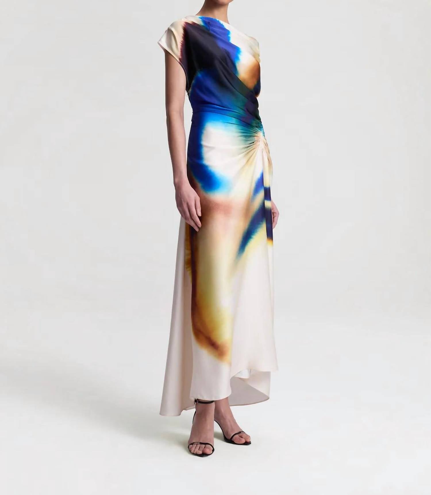 Style this maxi with your favorite statement necklace and sandals for the perfect look. Introducing the Women's Penny Satin Midi Dress by A.L.C., a masterpiece in the Lapis Multi colorway. This ankle-length sheath dress in luxurious satin showcases a multicolor painterly print and features a draped, off-the-shoulder neckline with artful ruching along the waist. Its fluid design and short sleeves create a soft, sculptural silhouette that moves effortlessly. Closure: Pull-on style. Ideal for spring vacations with a boho chic allure.