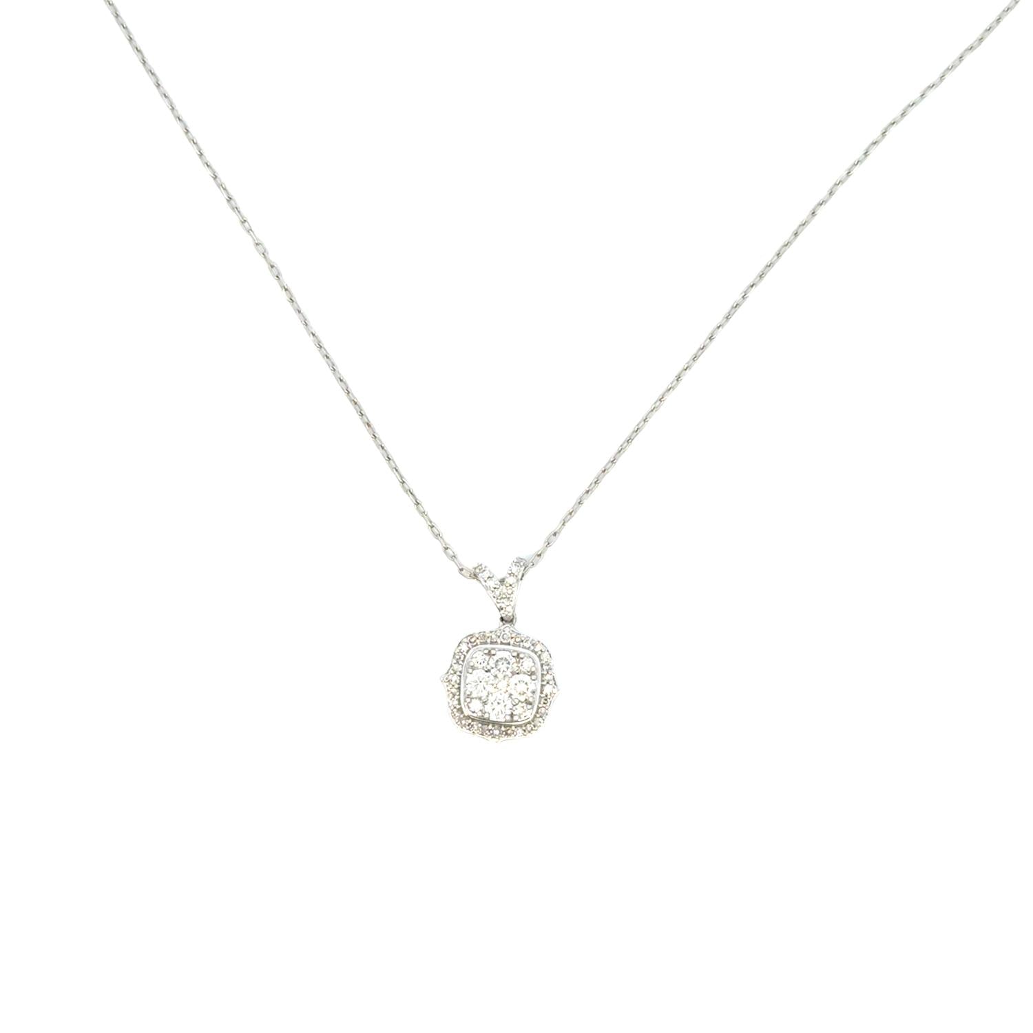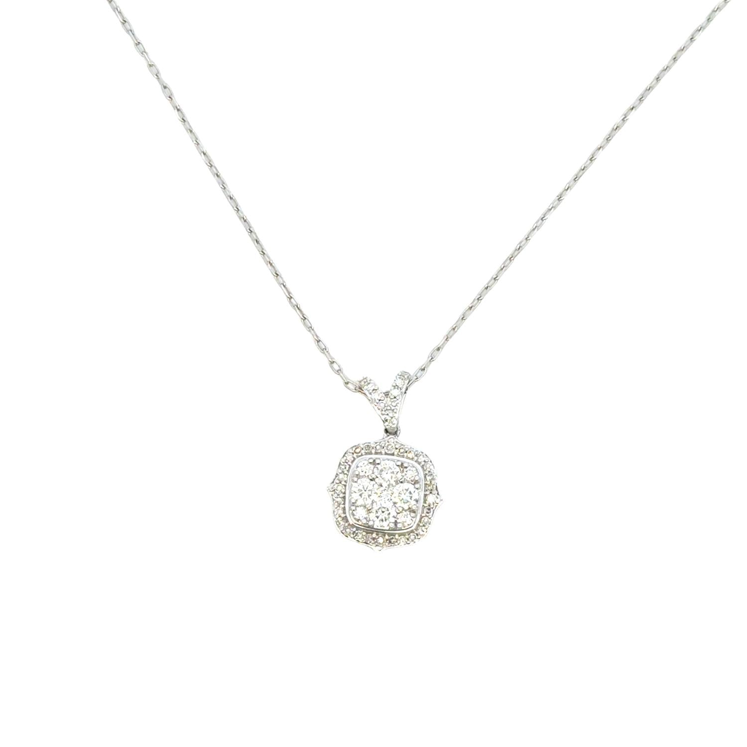 Elegant cushion-shaped pendant featuring 0.61 carat of natural round brilliant cut diamonds in a sophisticated cluster design. The center cluster of round brilliant diamonds is surrounded by a sparkling cushion-shaped halo, with additional diamonds adorning the bail for continuous sparkle. Crafted in 14k white gold (2.30 grams) with secure prong settings that maximize light reflection. This timeless design offers classic elegance perfect for special occasions or adding sophistication to everyday wear. Key Features: 0.61 total carat weight natural diamonds. Round brilliant cut diamonds throughout. 14k white gold construction (2.30 grams). Cushion halo setting with cluster center. Classic pendant design with diamond-set bail. Perfect for layering or wearing alone.
