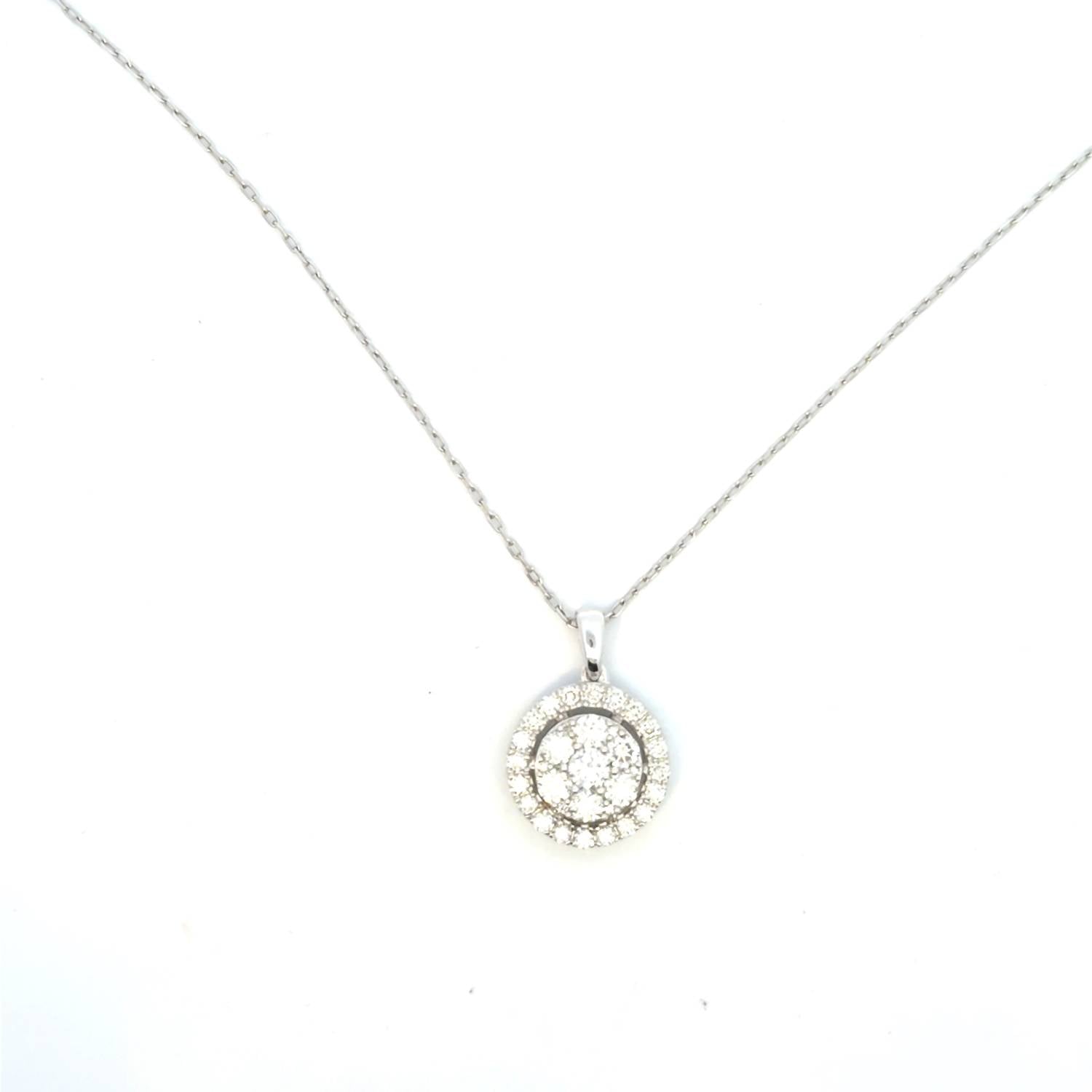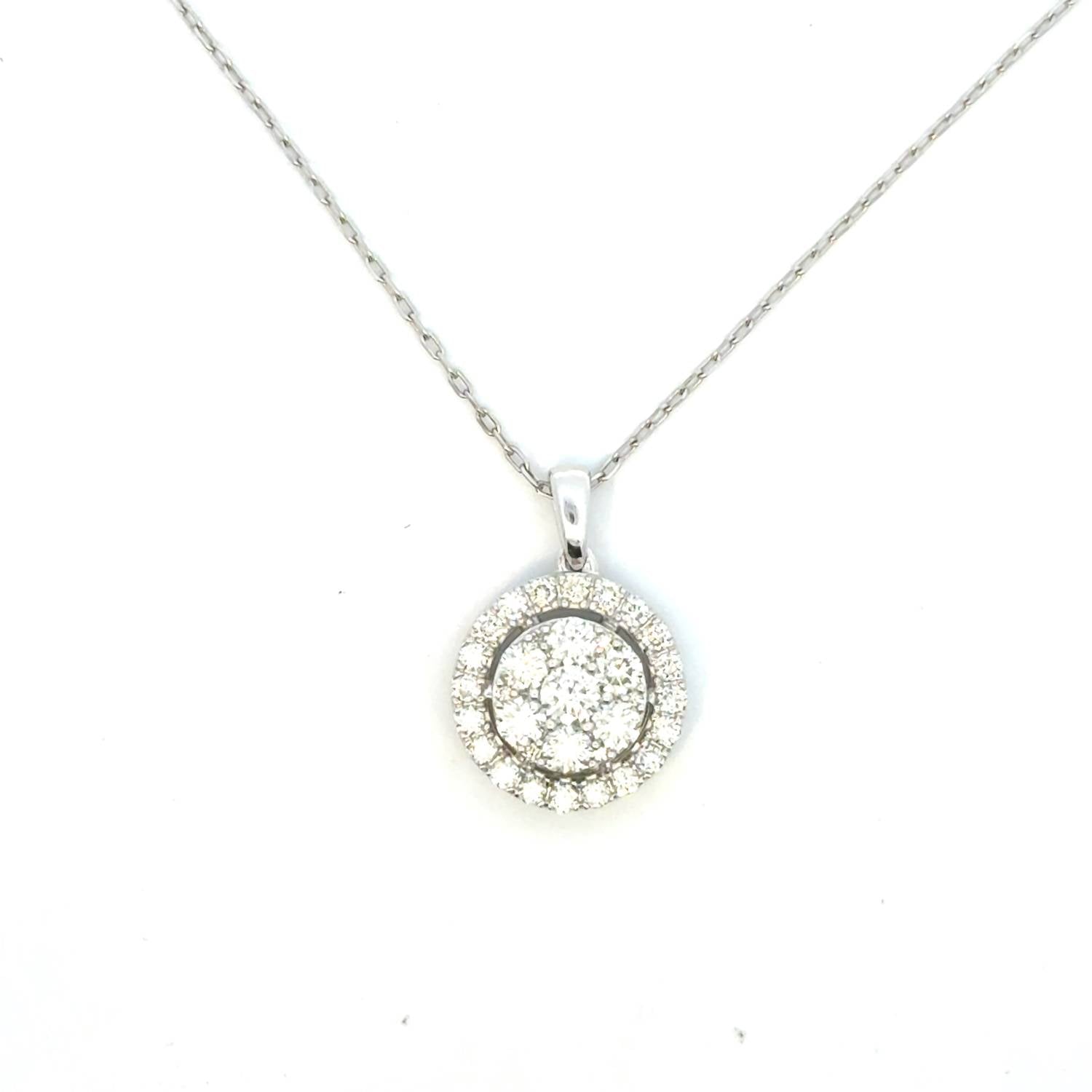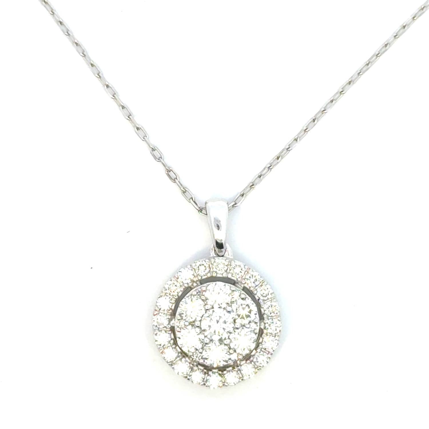The perfect stand-out necklace that complements even the most basic t-shirt. Classic halo pendant featuring 1.00 carat of natural round brilliant cut diamonds. The stunning center diamond is surrounded by a sparkling halo of smaller round brilliant diamonds, all secured in traditional prong settings that maximize brilliance and fire. Crafted in 14k white gold (2.25 grams) with a polished bail for smooth chain movement. This timeless design offers exceptional sparkle and elegance, perfect for everyday wear or special occasions. Key Features: 1.00 total carat weight natural diamonds. Round brilliant cut center stone with round brilliant halo. 14k white gold construction (2.25 grams). Halo setting with prong details. Classic pendant design. Perfect for layering or wearing alone.