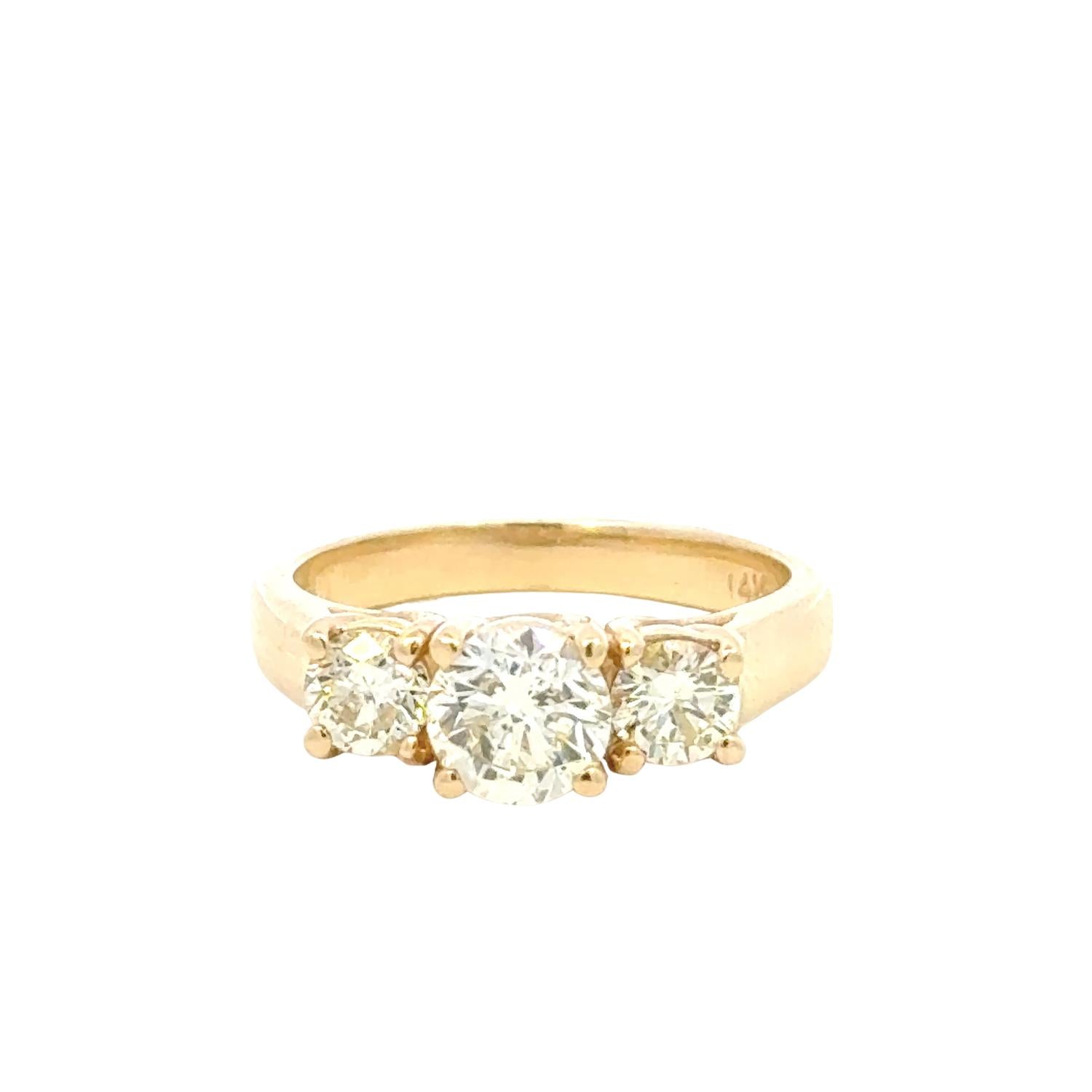 Wear this ring stacked or by itself... you can't go wrong. Classic three-stone ring size: 6.5 featuring 1.66 carats of natural round brilliant cut diamonds. The stunning center diamond is beautifully flanked by two matching side stones, all secured in traditional prong settings. Crafted in 14k yellow gold, this timeless design symbolizes past, present, and future. The warm yellow gold perfectly complements the brilliant diamonds, creating an elegant piece perfect for engagements, anniversaries, or special celebrations. Key Features: 1.66 total carat weight natural diamonds. Three round brilliant cut diamonds. 14k yellow gold construction. Classic prong setting. Three-stone/trinity design. Perfect for engagements or anniversaries.