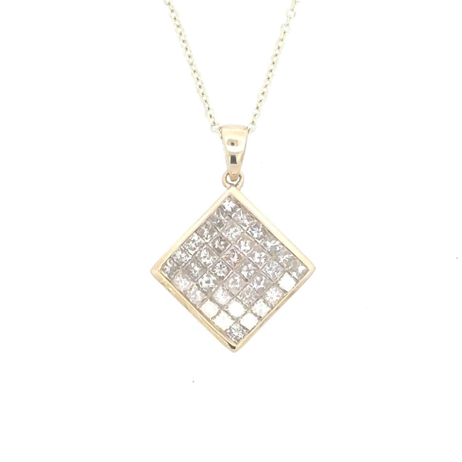 Discover the AAMIAA Stan Collection Natural Diamond Pendant, a stunning fine jewelry piece crafted from luxurious 14k yellow gold. Featuring 1.29-carat total weight princess-cut diamonds that radiate elegance, this pendant weighs 7.69 grams, showcasing its substantial feel and quality. This exquisite piece highlights natural diamonds expertly set for maximum brilliance and allure. A perfect addition to any jewelry collection, offering timeless sophistication and exceptional craftsmanship.