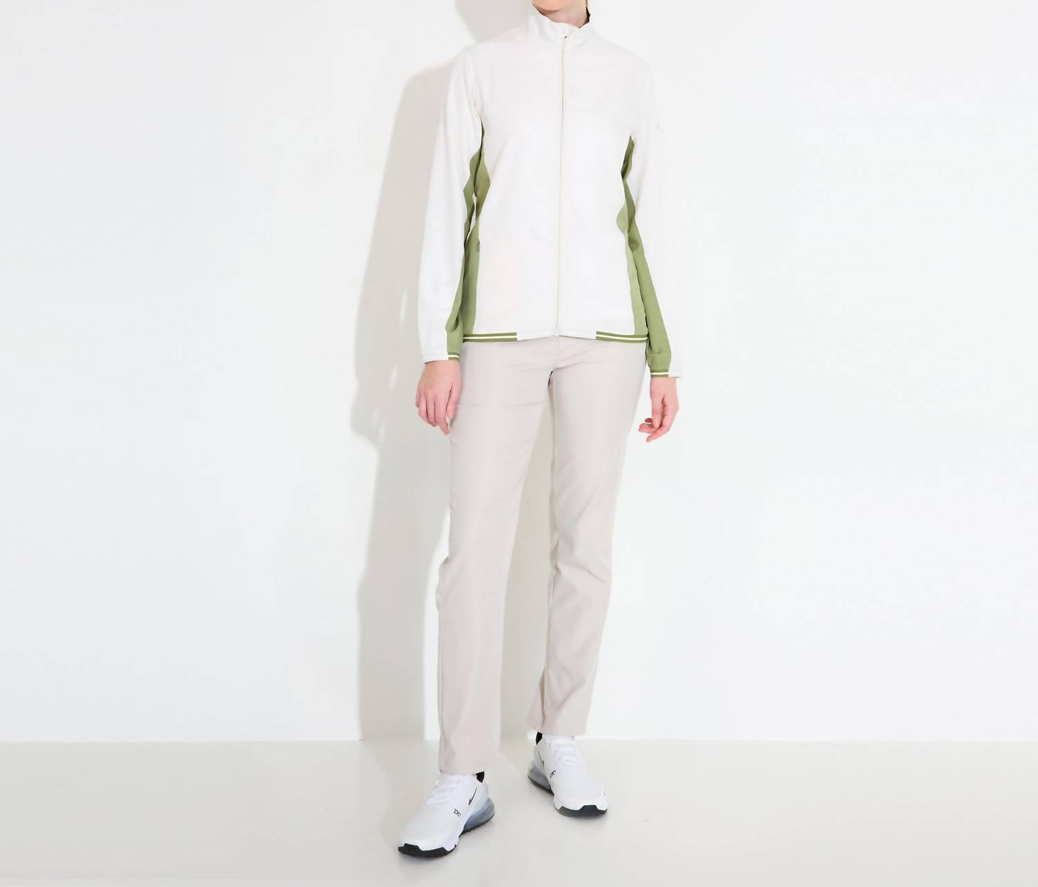 The ultimate cool-girl utility jacket. Discover the Lanark Stretch Wind Jacket by Abacus Sportswear US, a perfect blend of style and functionality for women in a refreshing Linden color. This lightweight utility jacket features a mockneck with long sleeves and a convenient zip closure, designed from a windproof recycled material. The garment includes practical pockets and is thoughtfully lined for added comfort. Easy to care for, simply machine wash and lay flat to dry. Weighing only 5 oz (157g), it's ideal for athleisure on game day. Sofia is 178 cm/5'8" and wears size M.