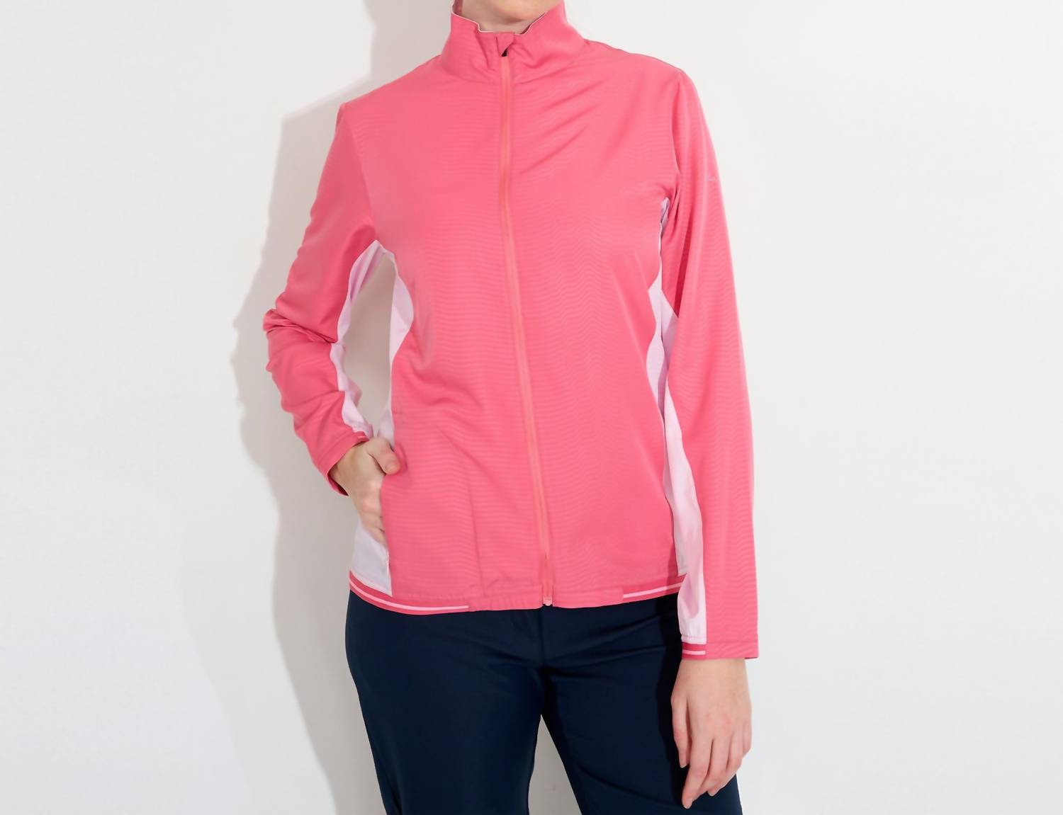 The coolest, most versatile utility jacket. Match it with your favorite pair of denim or throw it over any day dress. Introducing the Lanark Stretch Wind Jacket by Abacus Sportswear US, a stylish windbreaker perfect for game day in a vibrant Lipstick hue. This long-sleeve jacket features a mockneck design and is crafted from windproof recycled polyester, all with a discreet print. It includes practical zip closure and front pocket, finished with elastic edging at the sleeves and hem. With a garment weight of just 5 oz (157g), it's easy to wear and care for; simply machine wash and line dry.