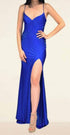 This elegant gown features a sleeveless V-neck bodice with corset boning and delicate thin straps for a structured yet refined look. The open lace-up strappy back, complemented by a zipper closure, adds a touch of allure. Designed with a floor-length fitted skirt, the gown includes a dramatic train and a side leg slit for added sophistication. Crafted from glitter knit fabric with heat stone beaded embellishments, it combines sparkle and elegance in a luxurious polyester finish.
