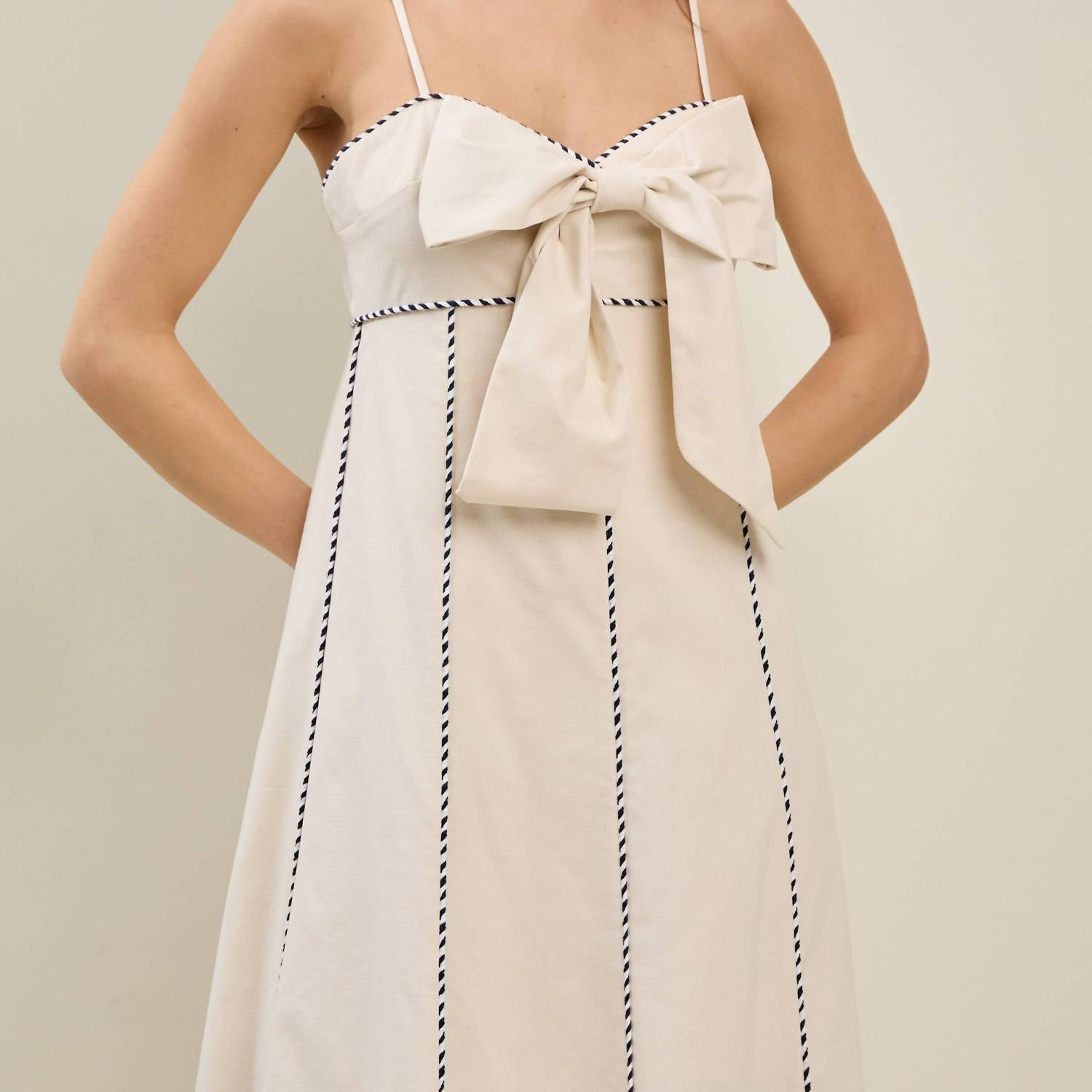 The perfect length dress does exist. Introducing the Kristen Bow Midi Dress by ABLE, a stunning choice for any spring dinner party. This solid cream, sleeveless dress features a shift silhouette with stripe piping and scallop edging, finished with a charming bow. Designed with a squareneck and adjustable straps, it ensures a perfect fit while the zip closure provides easy wear. For best care, dry clean and lay flat to dry.