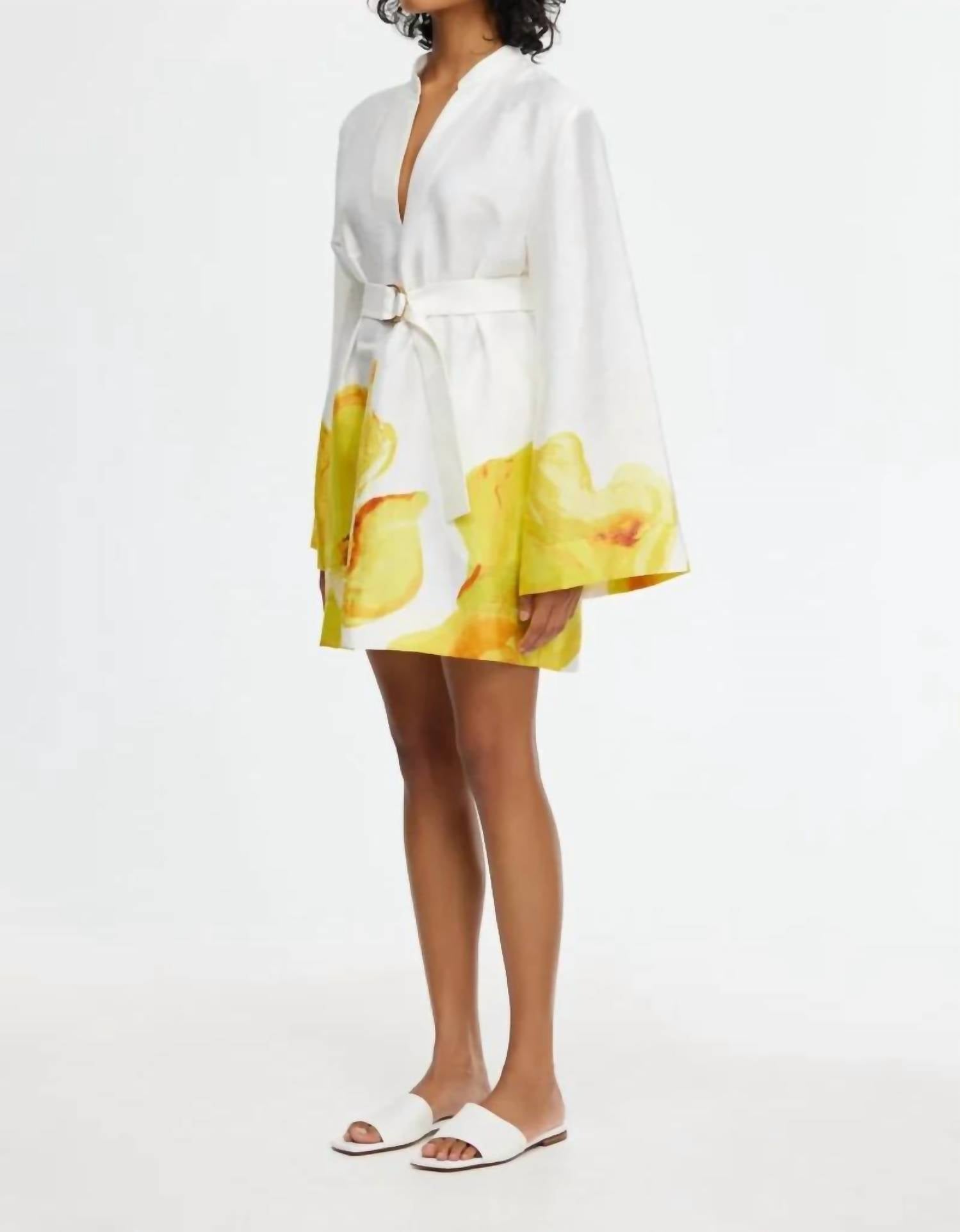 A short and breezy dress for those warmer days. Introducing the Doveford Mini Dress by Acler in Calla Lily, a perfect addition to any sophisticated wardrobe. This patterned mini dress features a flattering A-line silhouette with a V-neckline and elegant long sleeves. Crafted from a quality composition of 53% linen, 36% viscose, and 11% nylon, the dress offers a luxurious linen blend finish. Closure: Pullover style.