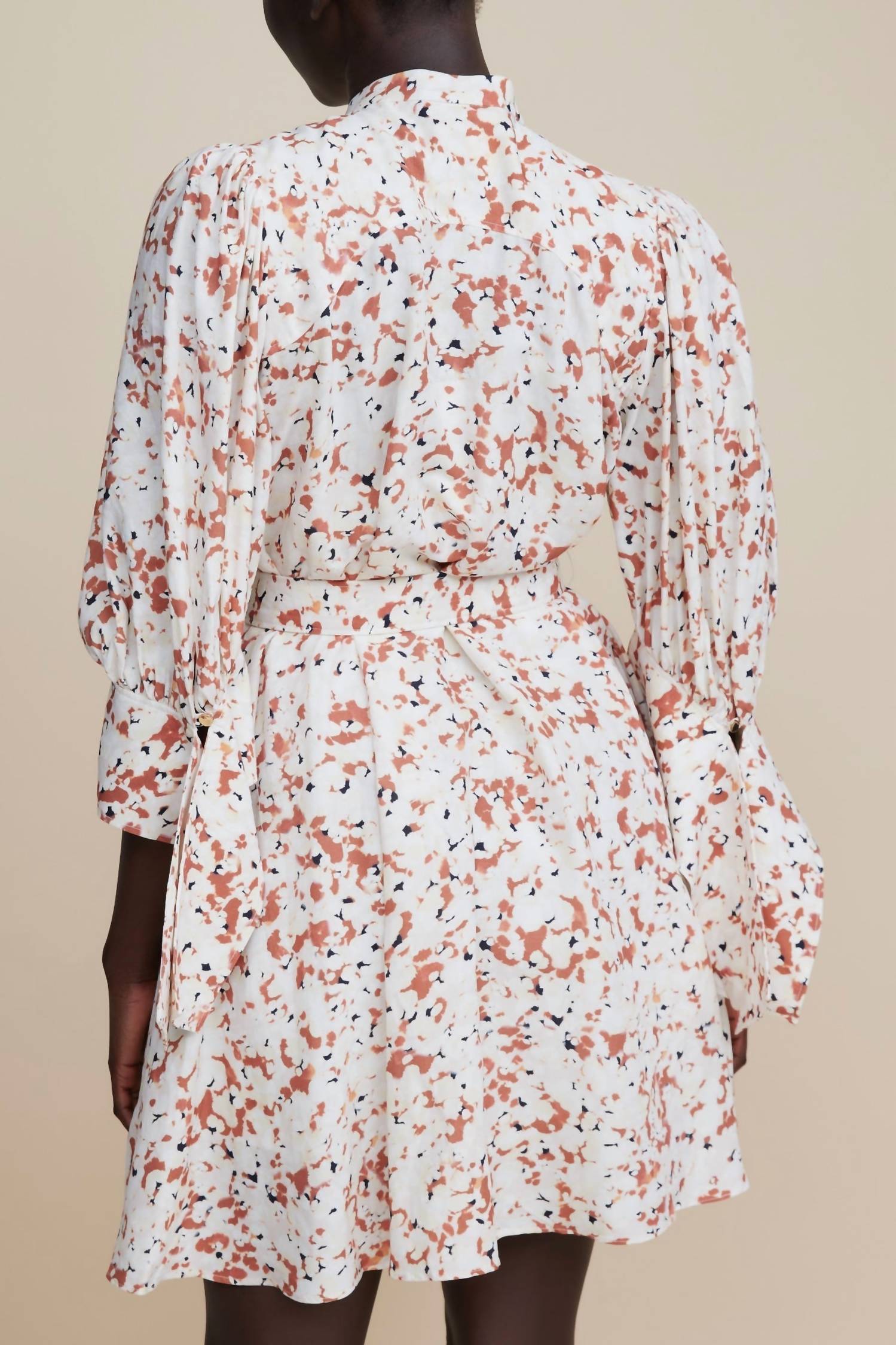 A short and breezy dress for those warmer days.Fitted at the waist. Relaxed throughout. Shirt dress silhouette. Accentuated cuffs, button front closure. Luxe gold hardware. Cinched at the waist. Adjustable belt. Mini dress, 3/4 length sleeves. Double d-ring belt. Composition: 60% Viscose Rayon 40% Linen. Fit: True to Size.