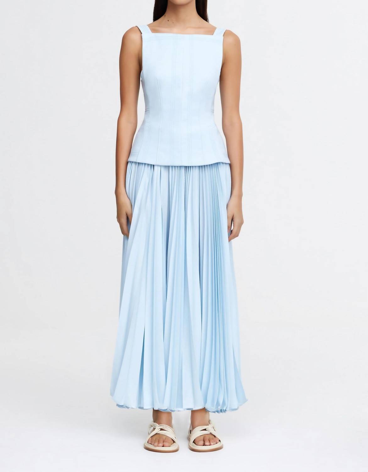 Who doesn't love a good maxi dress? This one you'll be reaching for season after season. Discover the ACLER Hollinshill Maxi Dress, a sophisticated choice in baby blue, perfect for summer occasions. This sleeveless dress features a structured bodice with a squareneck, complemented by a full pleated skirt that exudes grace. Crafted from 100% recycled polyester for the main and lining, with a contrast base composed of 95% polyester and 5% elastane, this dress is not only stylish but also environmentally conscious. Closure: Invisible center back zipper. Care instructions are not specified. Model is 177 cm (5'9.5") and is wearing an AU 8 / US 4.