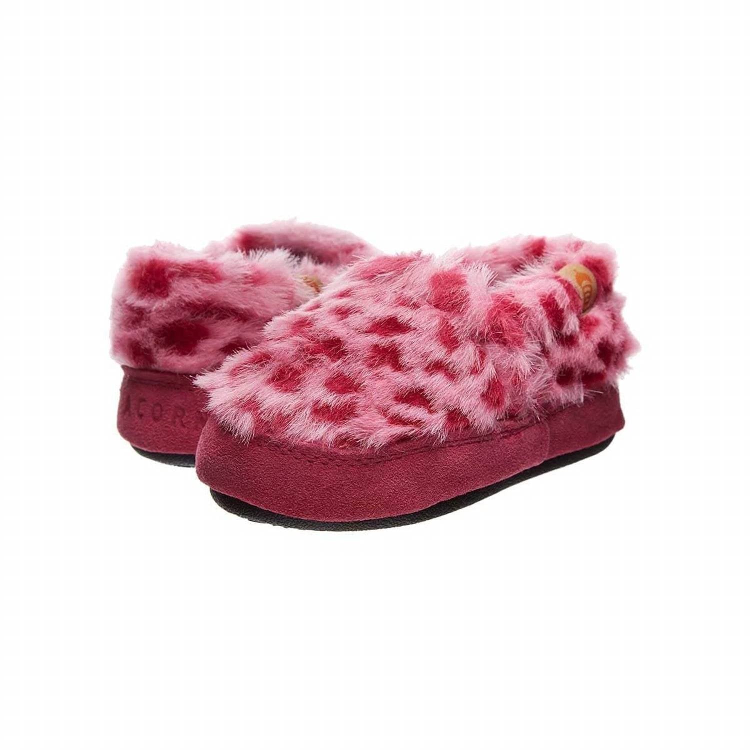 Introduce your toddler's feet to comfort with the Kids' Original Moccasin Slippers by Acorn in the playful Pink Ocelot color. Featuring a classic round toe design, these unisex slippers are perfect for vacation wear during the summer season. Designed with a stylish appeal, they are ideal for keeping little feet cozy and comfortable. Elevate your child's casual look with these versatile moccasins.