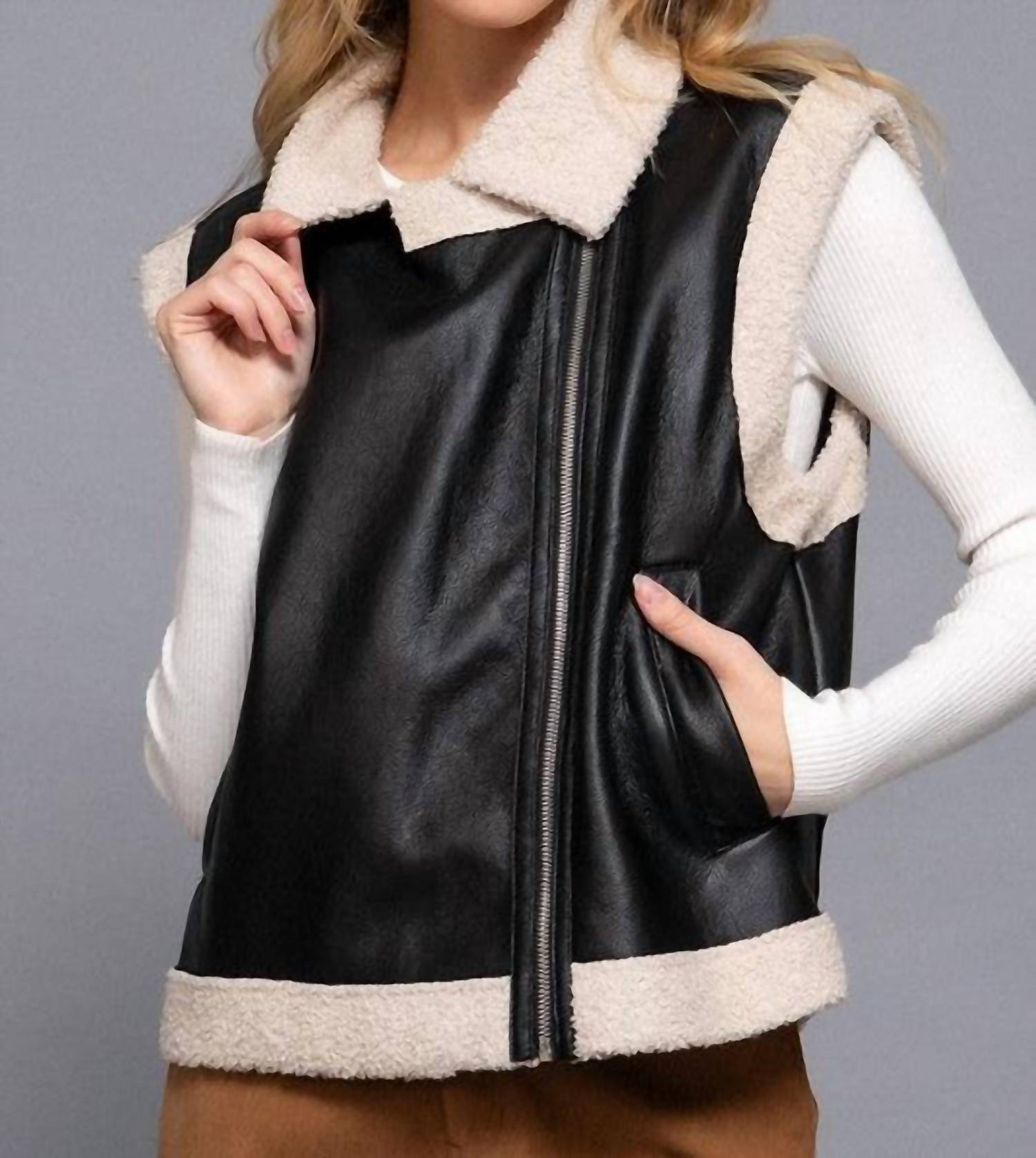 Enhance your wardrobe with the Faux Leather Inner Fur Vest by Active USA, a chic black vest tailored for a fashionable look. This sleeveless piece is crafted from durable polyester and features a convenient zip closure for easy wear. Designed with a stylish collar and handy pockets, it perfectly blends practicality with elegance. Care: Machine wash.