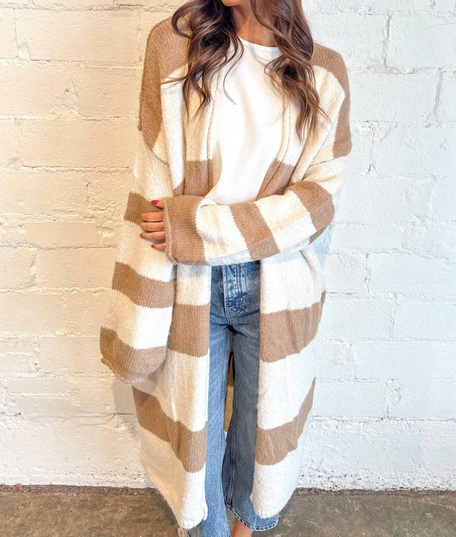 Introducing the Hampton Stripe Cardigan by Adeline, an embodiment of timeless charm and contemporary versatility. This tan and white cardigan features long sleeves and is crafted from a soft, lightweight knit, providing a relaxed and flattering fit. Composition: 60% Acrylic, 37% Nylon, 3% Spandex. Designed with an open front and a classic stripe pattern, it's perfect for layering over dresses and tops for both casual and sophisticated looks. Care: Hand wash cold, line dry, and cool iron. Model Brae is wearing a size small (5'7" height, 34" bust, 25" waist, 35" hips).