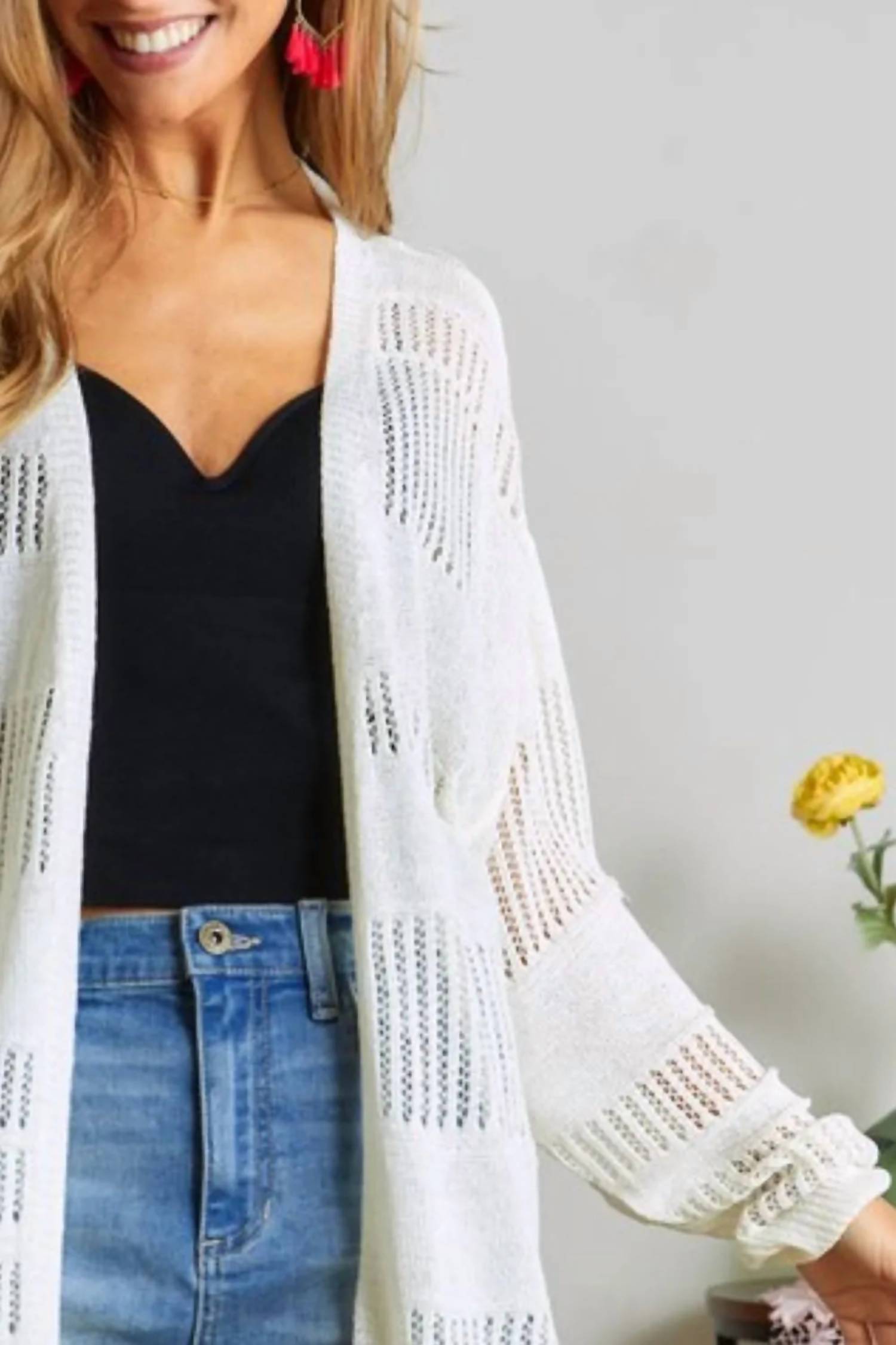 This cardigan will be a sweater-rotation favorite. Introducing the Lightweight Sweater Knit Cardigan by ADORA in a versatile ivory hue, perfect for adding a cozy touch to your fall ensemble. This long sleeve cardigan features an open front design with a relaxed fit, ideal for layering over any outfit. With a composition of 100% polyester, it offers slightly stretchy comfort while exuding quiet luxury for any occasion. Care instructions are simple: machine wash cold and tumble dry low. Measurements are available for sizes S (Bust: 34-36 in, Waist: 26-28 in), M (Bust: 37-38 in, Waist: 29-31 in), and L (Bust: 39-40 in, Waist: 32-33 in).