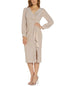 Sparkling metallic detail brings shimmery style to this elegant Adrianna Papell midi dress designed with a cascading ruffle accent at the waistline.| Falls below the knee to lower calf| V-neck; Midi silhouette | Hidden back zipper closure| Long sleeves with buttoned cuffs| Ruffled detail at front| Lined