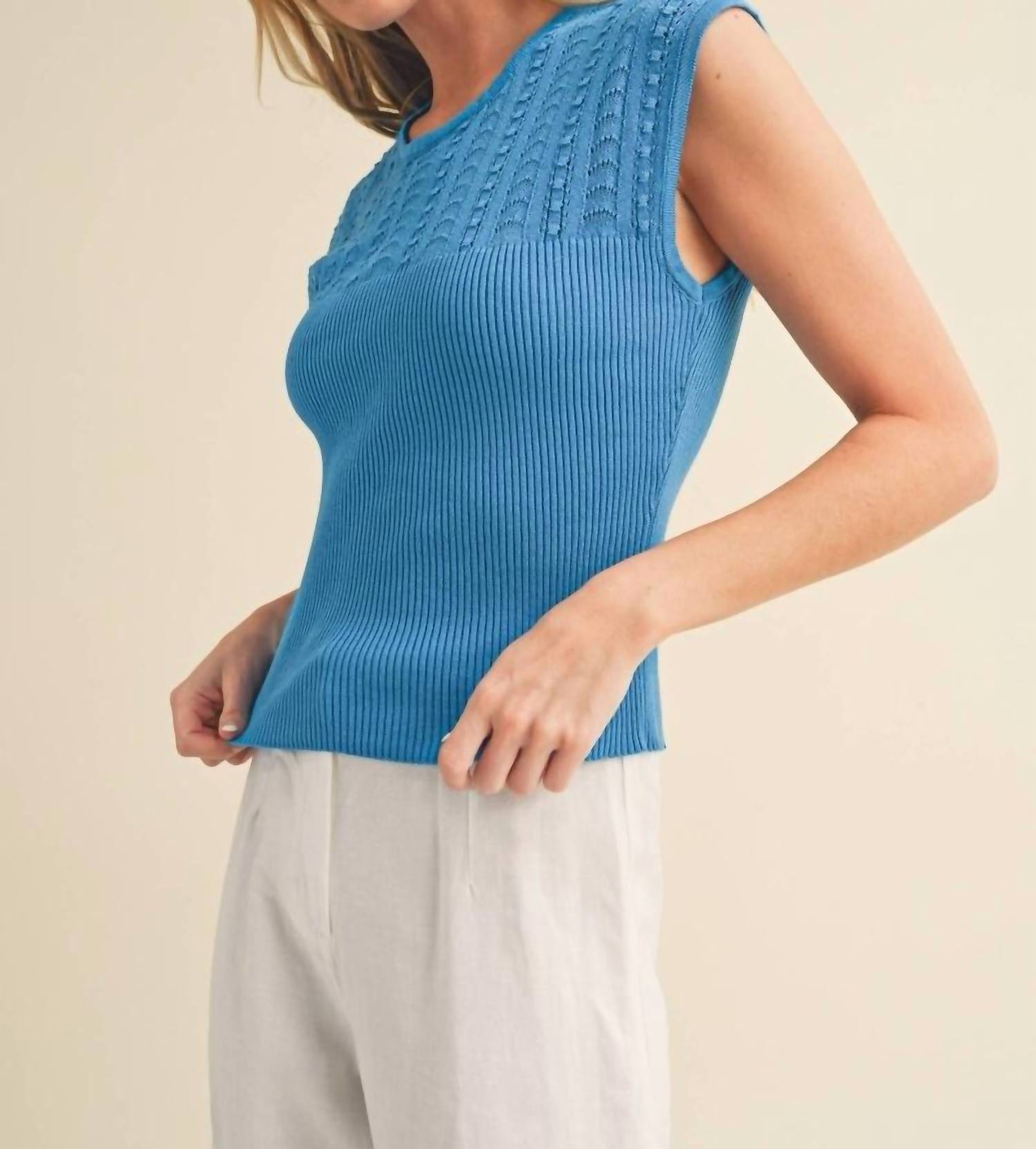 Introducing the Women's Tara Openwork Cap Sleeve Knit Top by AEMI + CO, a stylish addition to your wardrobe in an elegant blue hue. Designed with short cap sleeves, this top features a textured openwork pattern, providing a fresh take on classic tees. Crafted from 100% cotton, it promises a soft and slightly stretchy fit, perfect for spring outings. With a convenient pull-on closure and easy-care instructions of machine wash cold and tumble dry low, it blends comfort with practicality. Available in size options: S (Bust 34-35 in, Waist 26-27 in), M (Bust 36-37 in, Waist 28-29 in), L (Bust 38-39 in, Waist 30-31 in).
