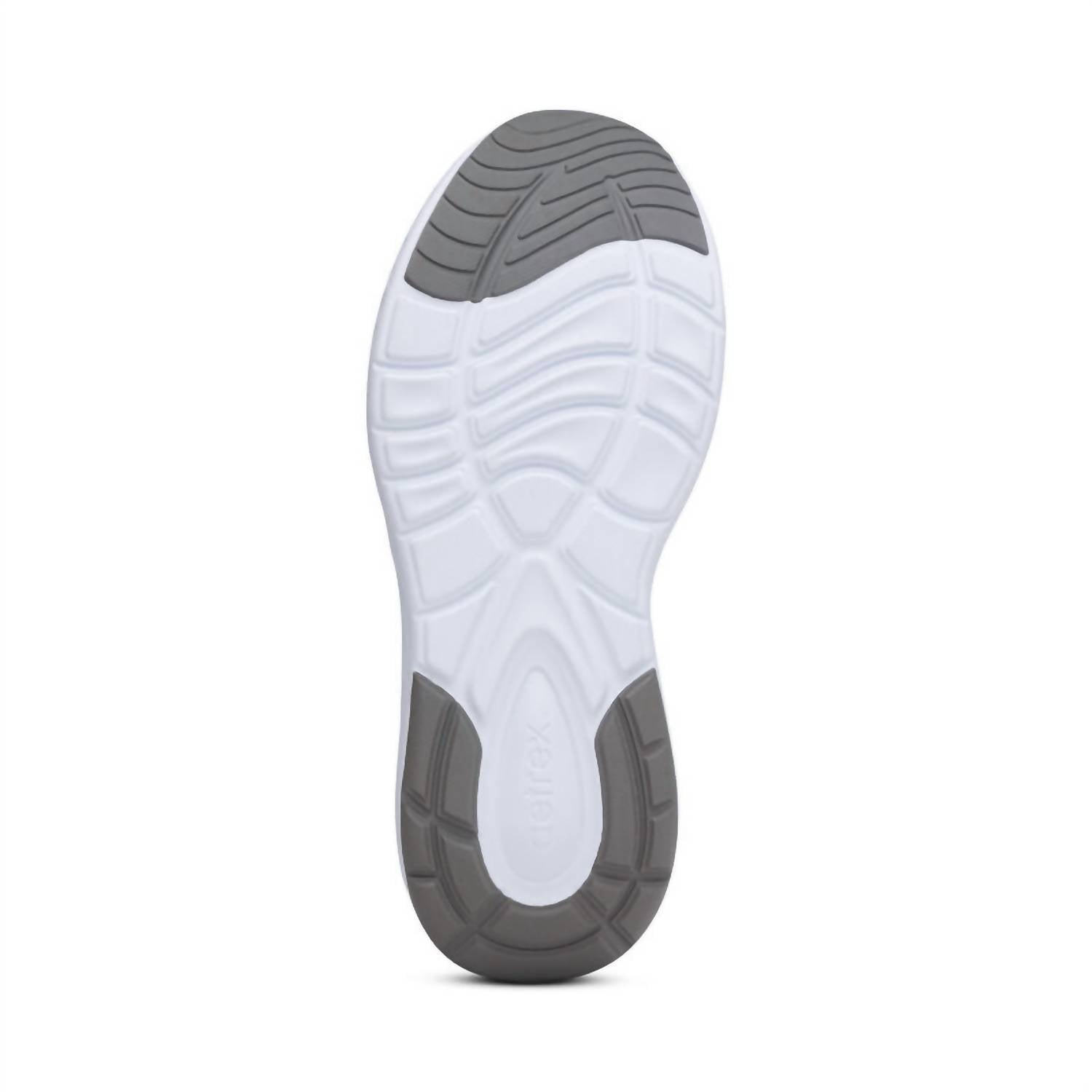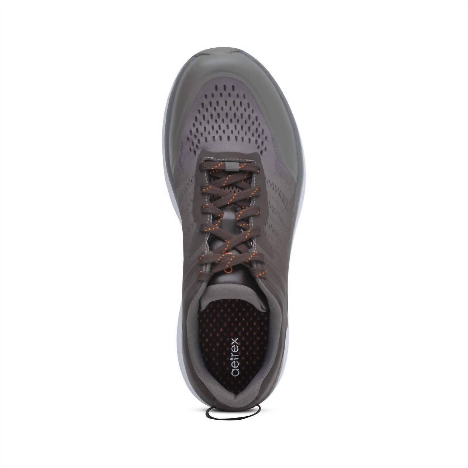 Step into unparalleled comfort with the Chase Arch Support Sneakers by Aetrex, crafted from breathable mesh in a sleek grey hue. These men's low-heeled shoes feature a 1.3" flat heel and a supportive insole with built-in arch support, UltraSky™ cushioning, and antimicrobial technology. Designed with adjustable laces, a padded collar, and tongue for a personalized fit, they're perfect for everyday streetwear or a relaxing vacation. With durable rubber pods on the outsole and machine washable properties, these sneakers offer both style and convenience for your active lifestyle.