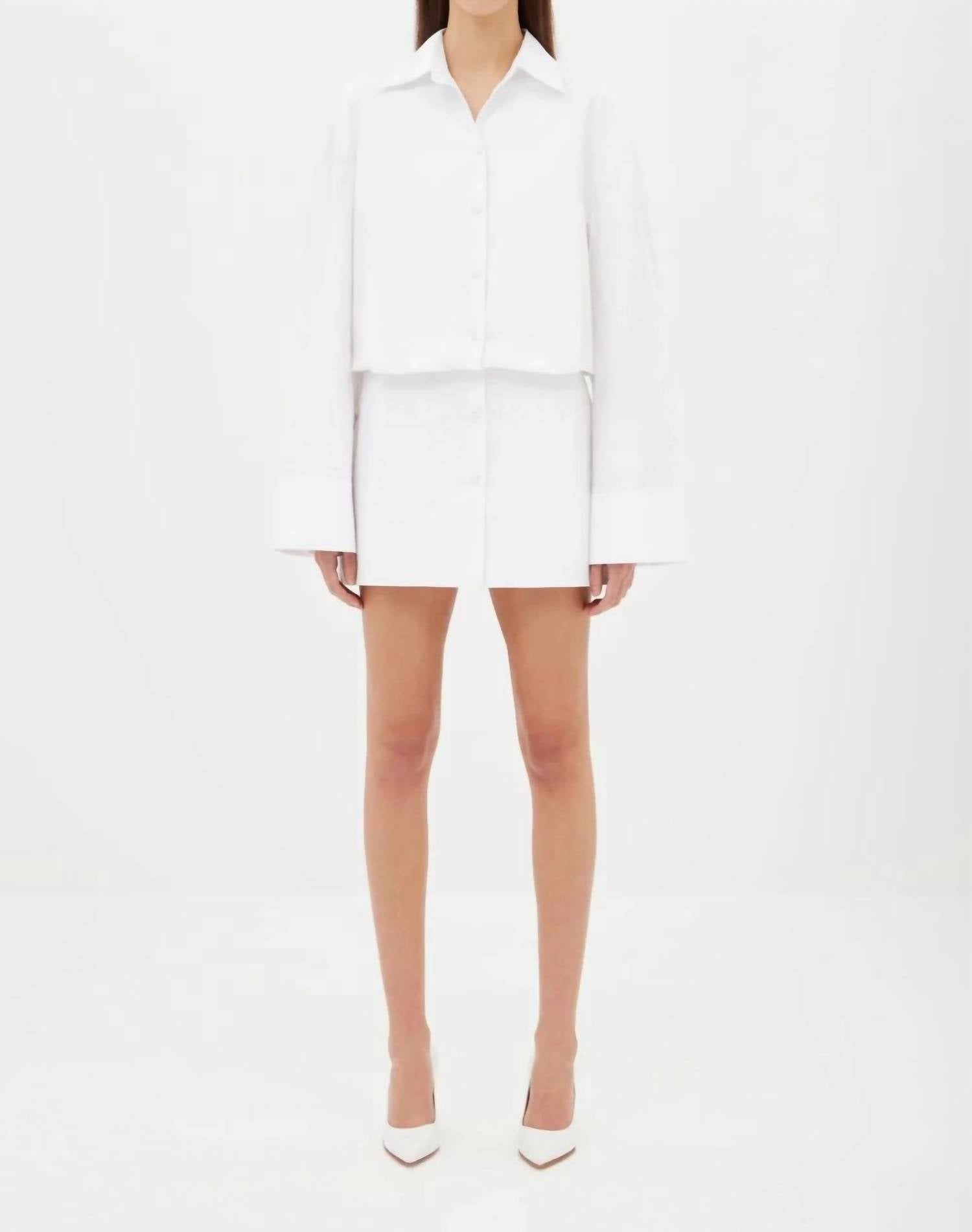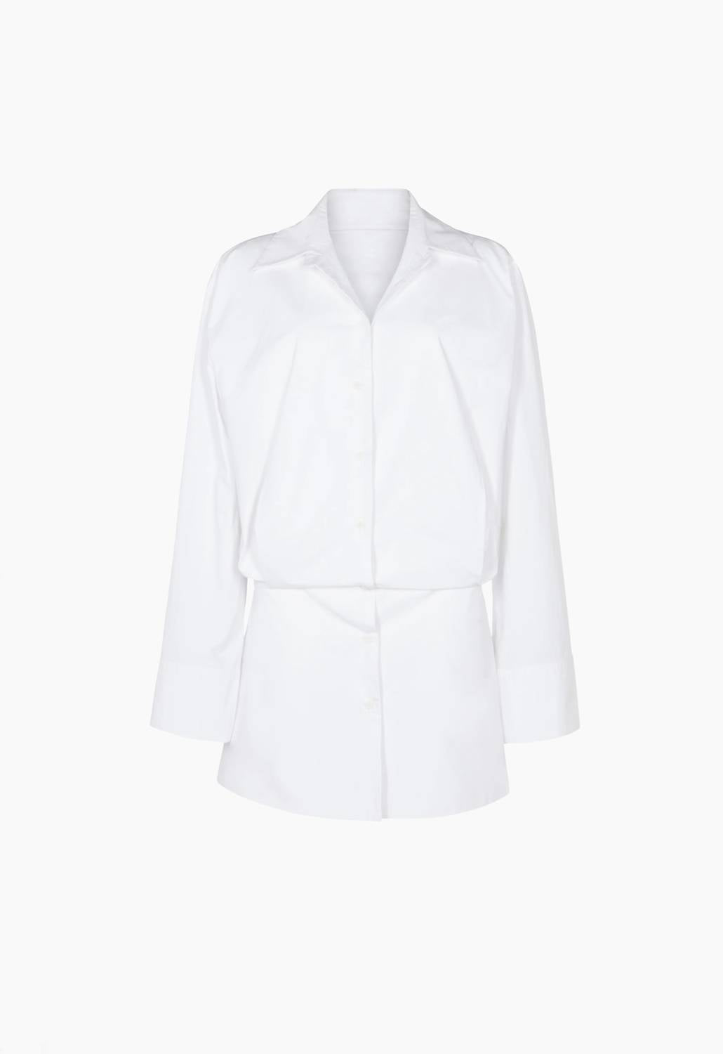 A short and breezy dress for those warmer days. Meet the AEXAE Cotton Shirt Dress in pristine white, a chic trans-seasonal piece for any wardrobe. This mini dress features long oversized bell sleeves for a bold statement, crafted entirely from thick cotton for a sturdy yet stylish feel. It boasts a tailored waistline and a hidden button placket for a seamless look and finishes with a hook and eye closure for easy wear. Ideal for day-to-night transitions, this dress promises versatility with its classic A-line silhouette.